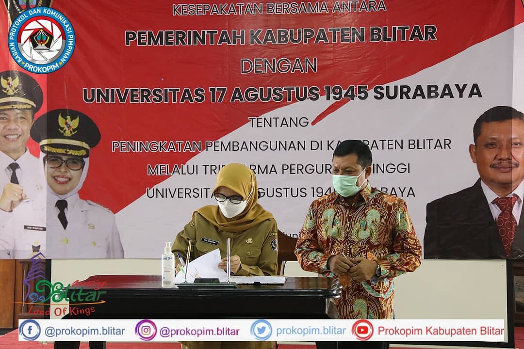 Dalam rangka menjalin hubungan kerjasama untuk peningkatan pembangunan di daerah. Pemerintah Kabupaten Blitar menyelenggarakan MoU dengan Universitas 17 Agustus 1945 Surabaya tentang Peningkatan Pembangunan di Kabupaten Blitar melalui Tri Dharma Perguruan Tinggi di Pendopo Ronggo Hadinegoro. Dalam acara ini Bupati Blitar Hj. Rini Syarifah didampingi oleh Asisten dan Kepala OPD …