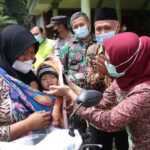 Bupati wanita pertama di Kabupaten Blitar ini juga berkesempatan memberikan makanan tambahan Balita serta menyerahkan KTP hasil layanan Dhrive Thru kepada pengurus adminduk.
