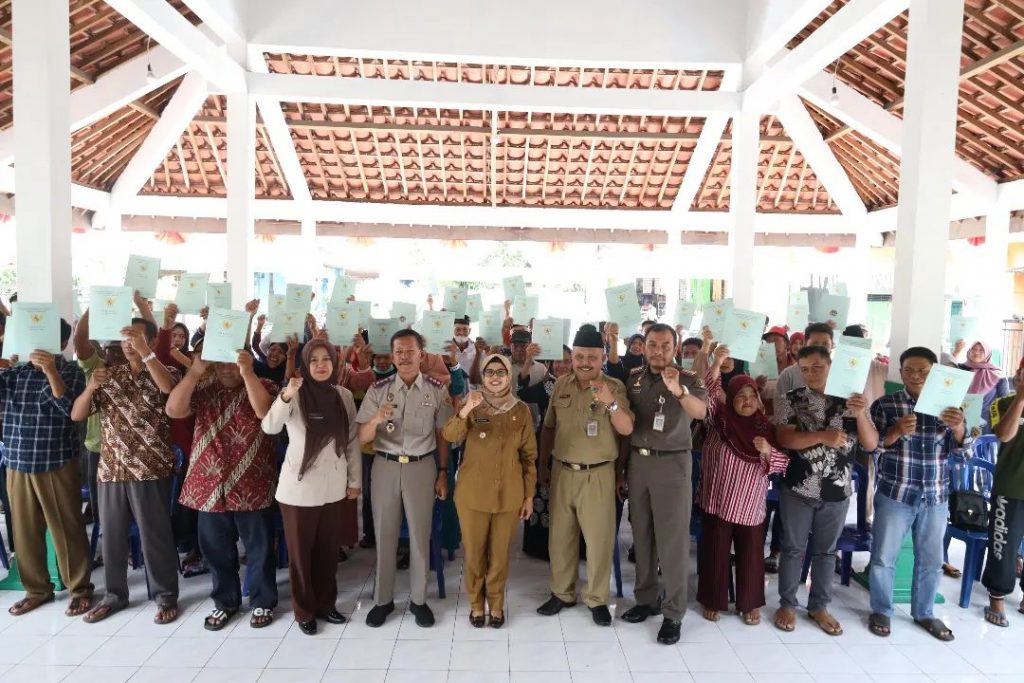 Bupati Blitar Hj. Rini Syarifah didampingi Kepala Kantah ATR/BPN Kabupaten Blitar Sukidi menyerahkan Pembagian Sertifikat Tanah Program Redistribusi Tanah Objek Landreform Tahun 2022 di Desa Kedawung dan Desa Sumberasri Kecamatan Nglegok. Turut hadir pada penyerahan sertifikat tanah ini yaitu Kepala Dinas Perkim, Kepala Bapenda dan Forkopimcam Nglegok.