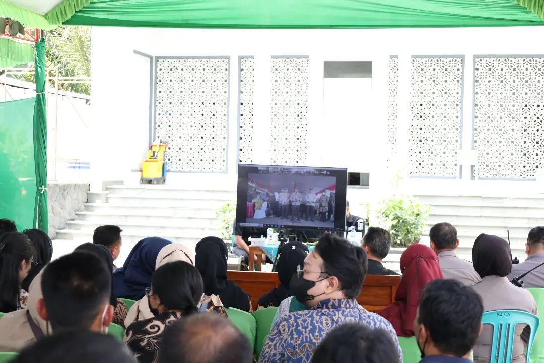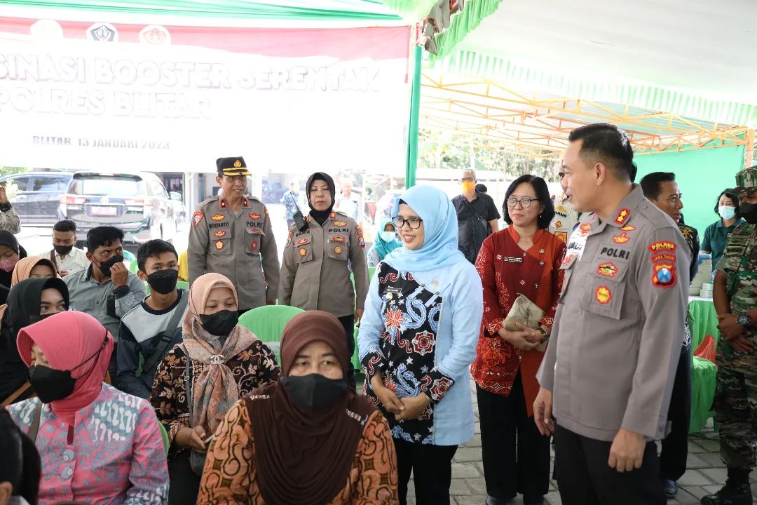 Bupati Blitar Hj. Rini Syarifah bersama Kapolres Blitar didampingi Kepala Dinas Kesehatan dan Kalaksa BPBD menghadiri acara Vaksinasi Massal yang diselenggarakan oleh Polda Jawa Timur secara virtual dan serentak di masing – masing wilayah Polres/Polresta se – Jawa Timur pada Jumat, 13 Januari 2022. Vaksinasi massal secara virtual di Polres Blitar dilaksanakan di area Masjid Asyakirin Kelurahan Klemunan Kecamatan Wlingi. Turut hadir Forkopimcam Wlingi dan Kepala Desa Klemunan.