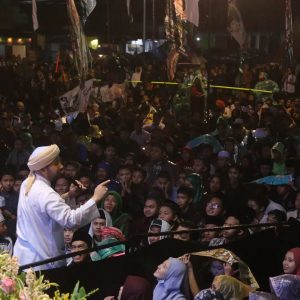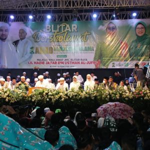 Bupati Blitar Hj. Rini Syarifah mendampingi Anggia Ermarini Wakil Ketua Komisi IV DPR RI menghadiri acara Blitar Bersholawat bersama Habib Ja’far bin Utsman Al Jufri bertempat di Alon – Alon Pemkab Blitar di Kanigoro pada Jumat, 10 Februari 2023.