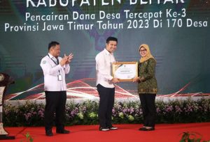 Bupati Blitar, Hj. Rini Syarifah menerima penghargaan pencairan Dana Desa tercepat ke-3. Penghargaan ini diserahkan Wakil Gubernur Jawa Timur, Dr. H. Emil Elestianto Dardak, B.Bus., M.Sc. pada Rapat Koordinasi Kemiskinan dan Percepatan Pencairan Dana Desa yang digelar di Hotel Santika Premiere, Surabaya pada Selasa, 7 Maret 2023.