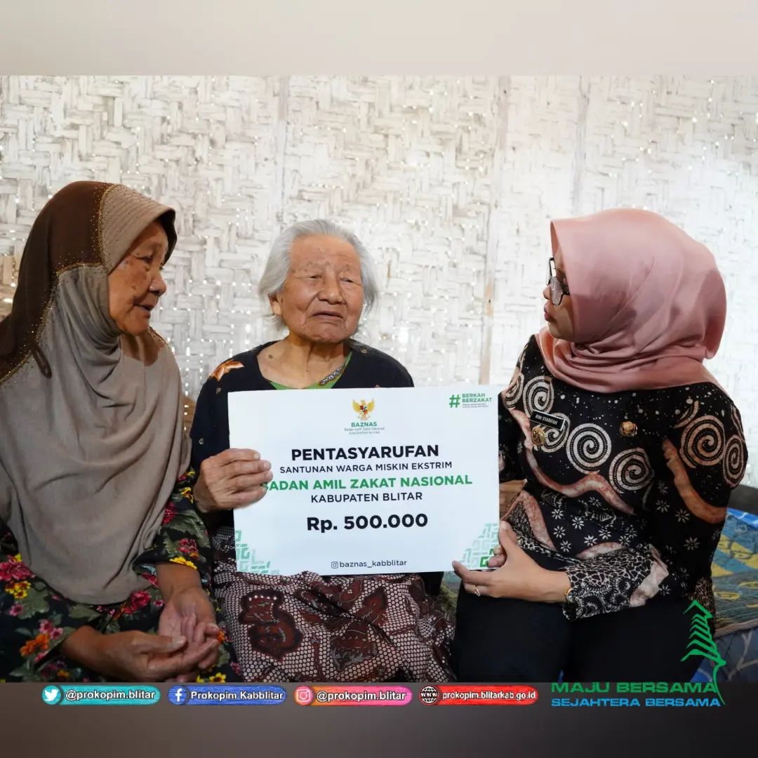 Bupati Blitar Hj. Rini Syarifah , bersama Baznas dan Dinas Sosial Kabupaten Blitar melaksanakan kegiatan tasyaruf kepada warga tidak mampu ekstrem yaitu Bu Misiyem yang bertempat tinggal di Desa Sumberingin Kecamatan Sanankulon , pada hari Kamis 16 Maret 2023.