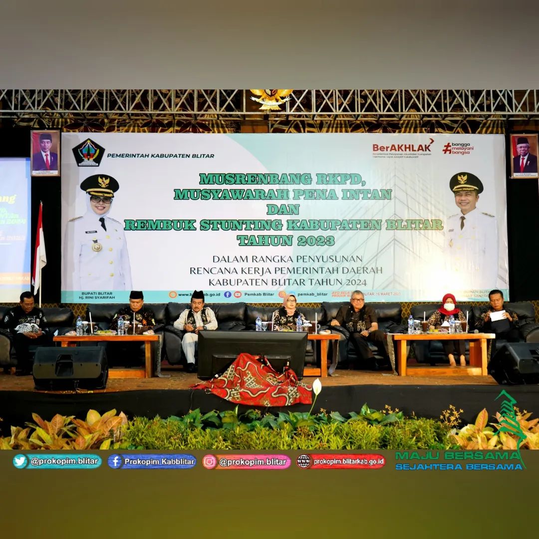 Bupati Blitar Hj. Rini Syarifah membuka Musrenbang RKPD Tahun 2024, Musyawarah Perempuan, Anak, Penyandang Disabilitas serta Kelompok Rentan (PENA INTAN) tahun 2024 dan Rembuk Stunting Kabupaten Blitar Tahun 2023, yang dilaksanakan di Hall Kampung Coklat , Kamis 16 Maret 2023. Turut hadir dalam acara tersebut , Sekretaris Daerah , Wakil Ketua DPRD, Bakorwil III Malang, BKKBN Provinsi Jawa Timur.