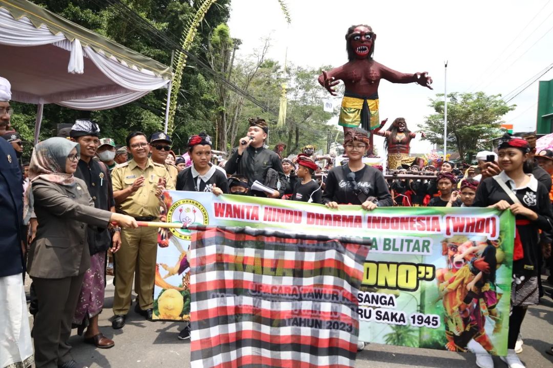 Bupati Blitar, Hj. Rini Syarifah memberangkatkan 61 ogoh-ogoh. Kegiatan dalam rangka Tawur Agung Kasanga menjelang Nyepi ini digelar di Kecamatan Wlingi pada Selasa, 21 Maret 2023.