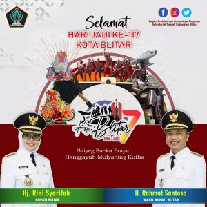 Selamat Hari Jadi ke – 117 Kota Blitar April 3, 2023 35 ViewsAtas nama Masyarakat dan Pemerintah Kabupaten Blitar mengucapkan Selamat Hari Jadi ke 117 Kota Blitar1 April 2023Saiyeg Saeka Praya, Hanggayuh Mulyaning Kutha
