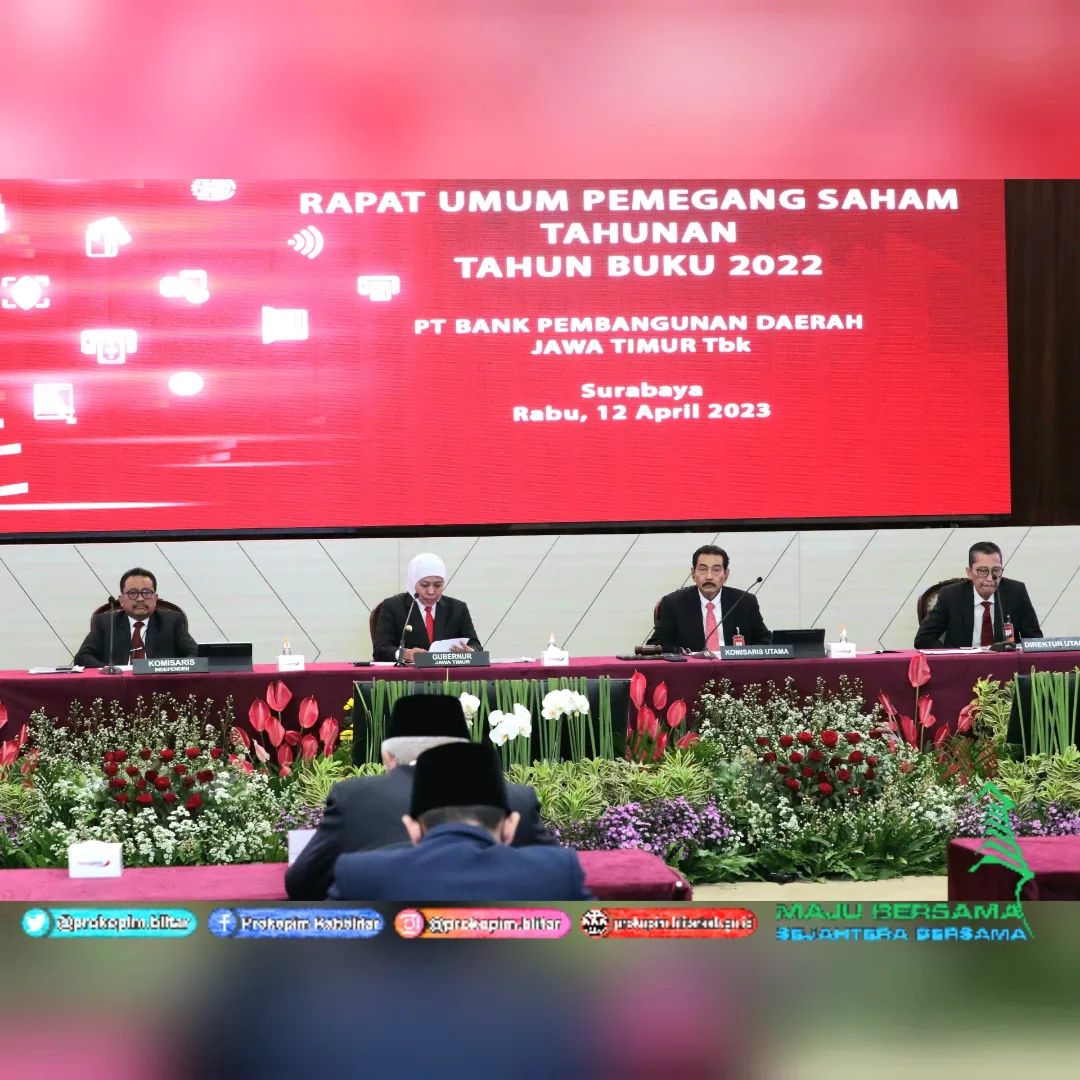Bupati Blitar Hj. Rini Syarifah menghadiri Rapat Umum Pemegang Saham (RUPS) Tahunan Tahun Buku 2022 , yang dipimpin langsung oleh Gubernur Jawa Timur dan diikuti oleh Kepala Daerah se-Jawa Timur di Kantor Bank Jatim Pusat Surabaya , pada hari Rabu 12 April 2023.