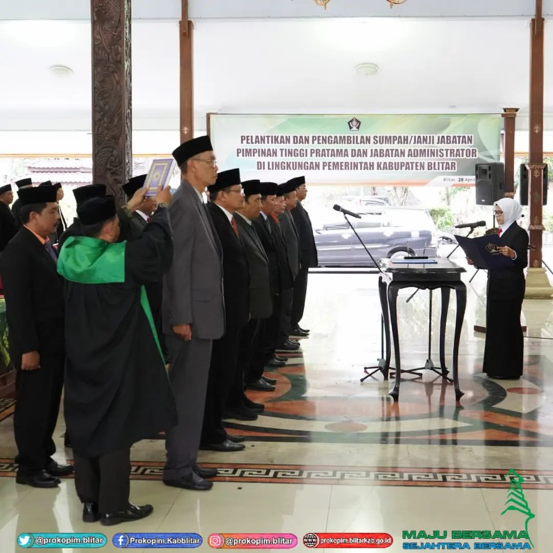 Pemerintah Kabupaten Blitar melaksanakan Pelantikan Dan Pengambilan Sumpah/Janji Jabatan Pimpinan Tinggi Pratama Dan Jabatan Administrator Di Lingkungan Pemerintah Kabupaten Blitar di Pendopo Ronggo Hadinegoro pada hari Jumat 28 April 2023. Turut hadir dalam kegiatan tersebut Ketua DPRD Kabupaten Blitar dan Sekretaris Daerah.