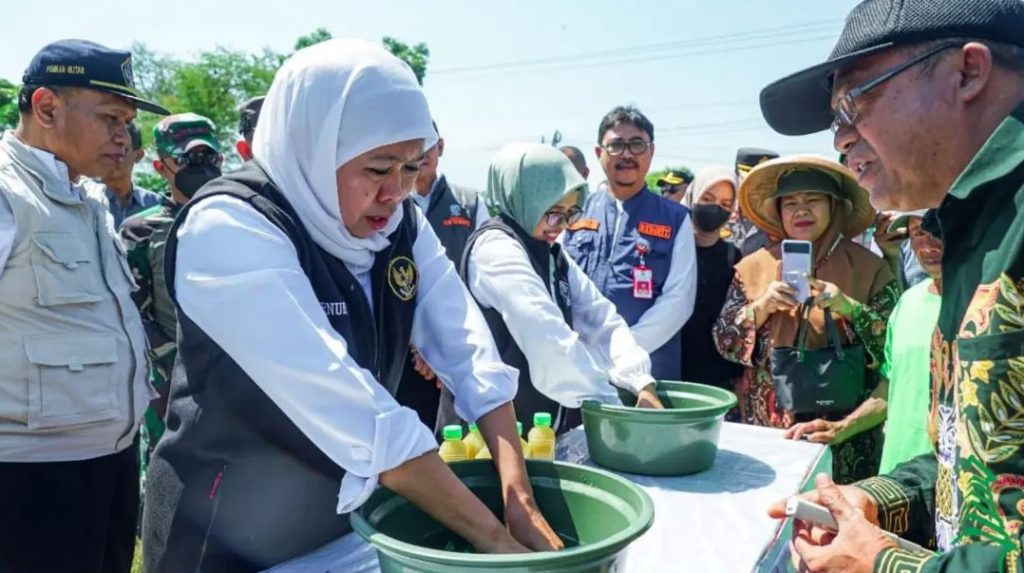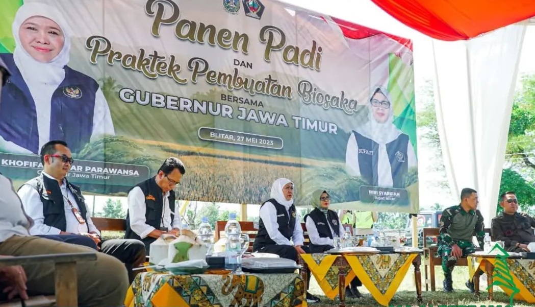 Bupati Blitar Hj. Rini Syatifah hadir dalam kegiatan Panen Raya dan Praktek Pembuatan Biosaka bersama Gubernur Jawa Timur Dra. Hj. Khofifah Indar Parawansa, M.Si. yang di selenggarakan pada hari Sabtu 27 Mei 2023 di Desa Soso, Kecamatan Gandusari. Turut hadir Forkopimda Blitar, Sekda Kabupaten Blitar dan jajaran pejabat Provinsi Jawa Timur. Padi yang dipanen ini adalah padi yang ditanam menggunakan elisitor Biosaka, pupuk non kimiawi penemuan dan buatan Muhammad Anshar warga Kecamatan Wates, Kabupaten Blitar.