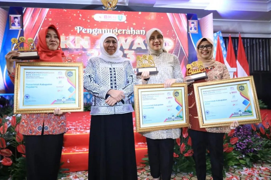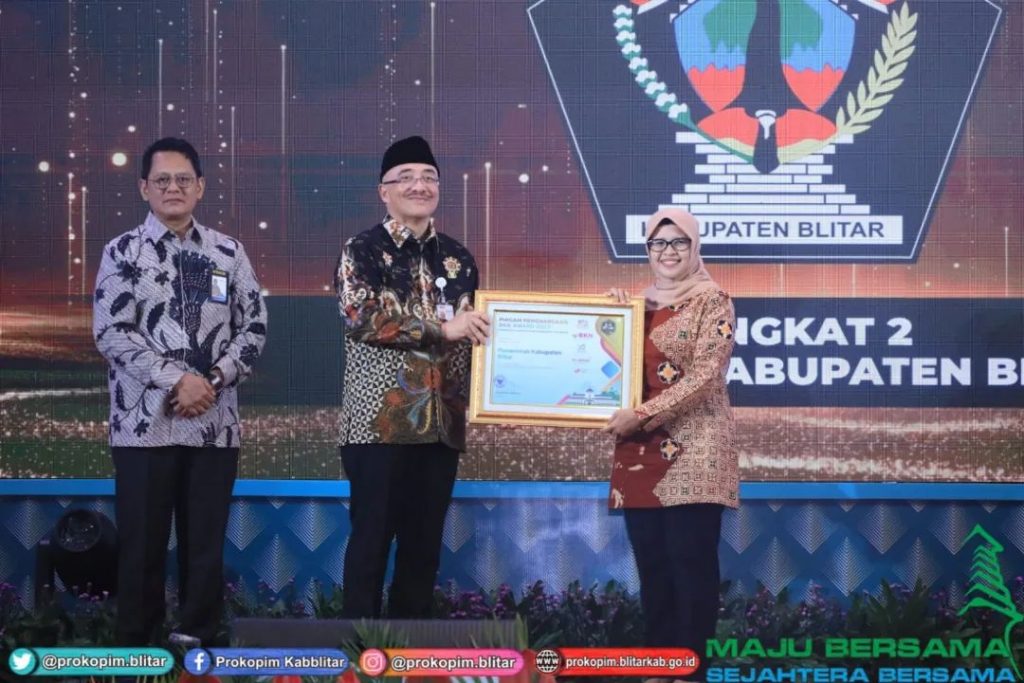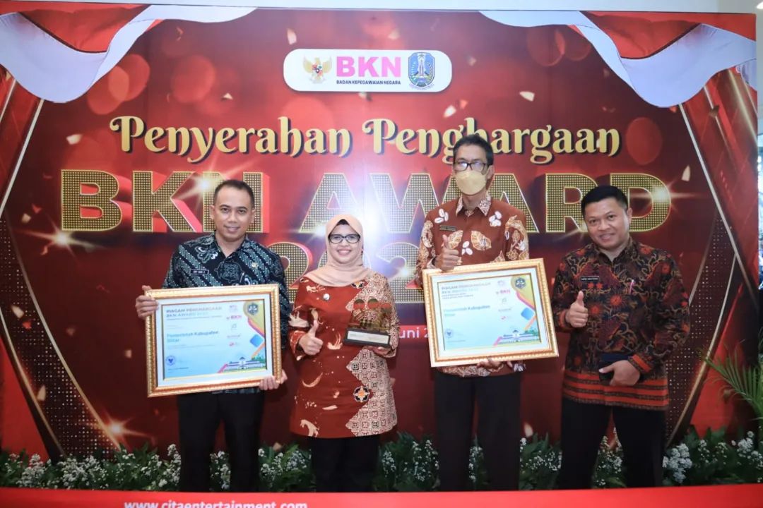 Bupati Blitar, Hj. Rini Syarifah menerima dua penghargaan dalam ajang BKN Award tahun 2023. Penghargaan dengan kategori Implementasi NSPK Manajamen ASN Terbaik serta terbaik kedua kategori Perencanaan