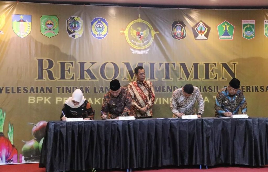 Bupati Blitar Hj. Rini Syarifah mengikuti acara Rekomitmen Penyelesaian Tindak Lanjut Rekomendasi Hasil Pemeriksaan (TLRHP) BPK Perwakilan Provinsi Jawa Timur di wilayah Sub Auditorat Jawa Timur III pada Rabu, 14 Juni 2023 bertempat di Grand Panglima Kota Kediri.
