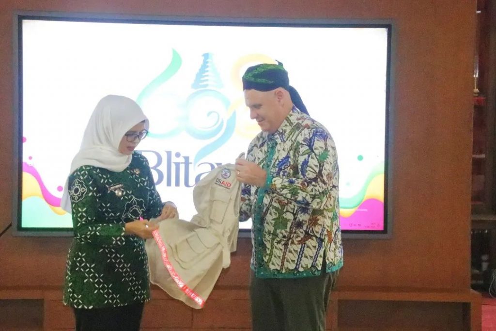 Bupati Blitar Hj. Rini Syarifah menerima kunjungan dari Direktur USAID Indonesia Mr. Jeffery Cohen bertempat di Pendopo Ronggo Hadi Negoro pada hari Jumat, 16 Juni 2023. Kunjungan ini dalam rangka USAID Mission Director sekaligus Lokakarya Penyampaian Hasil Audit Sosial Perkawinan Anak di Kabupaten Blitar. Jeffery Cohen, Mission Director USAID ERAT menyatakan dirinya sangat bangga mendapat kesempatan untuk hadir kembali di Kabupaten Blitar. Dirinya memberi apresiasi tinggi terhadap kebijakan Bupati Blitar terkait peningkatan kesejahteraan perempuan, penurunan angka stunting serta kasus perkawinan anak di daerahnya.