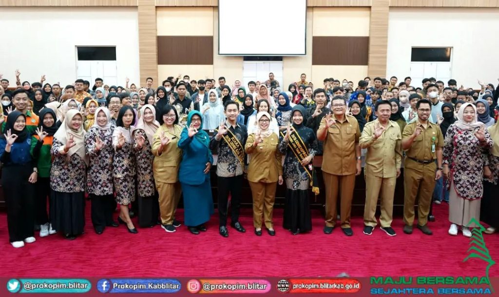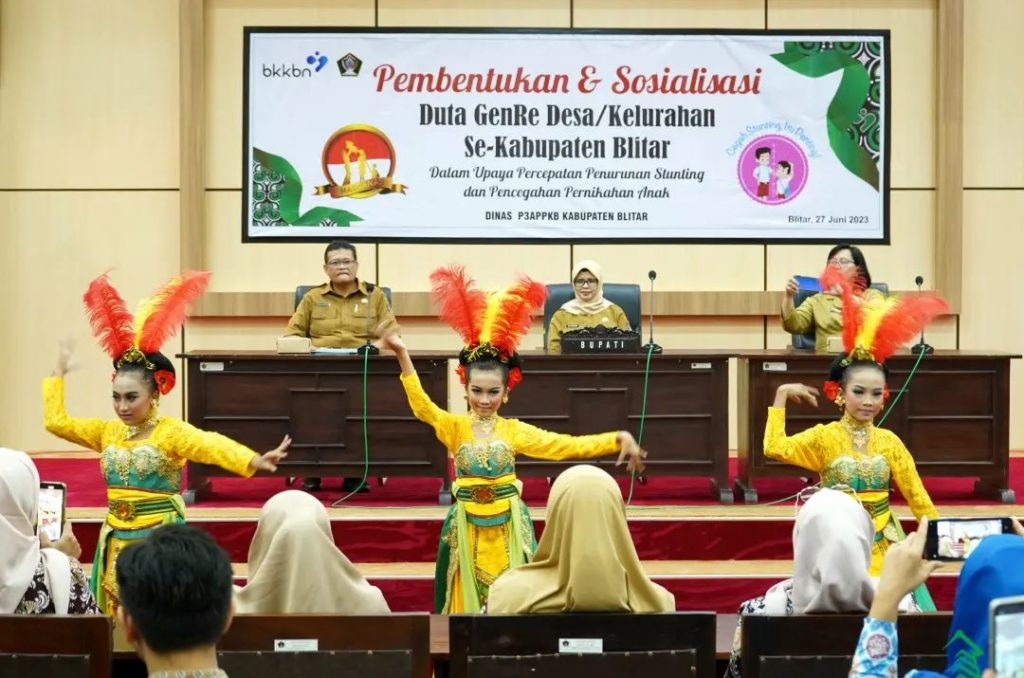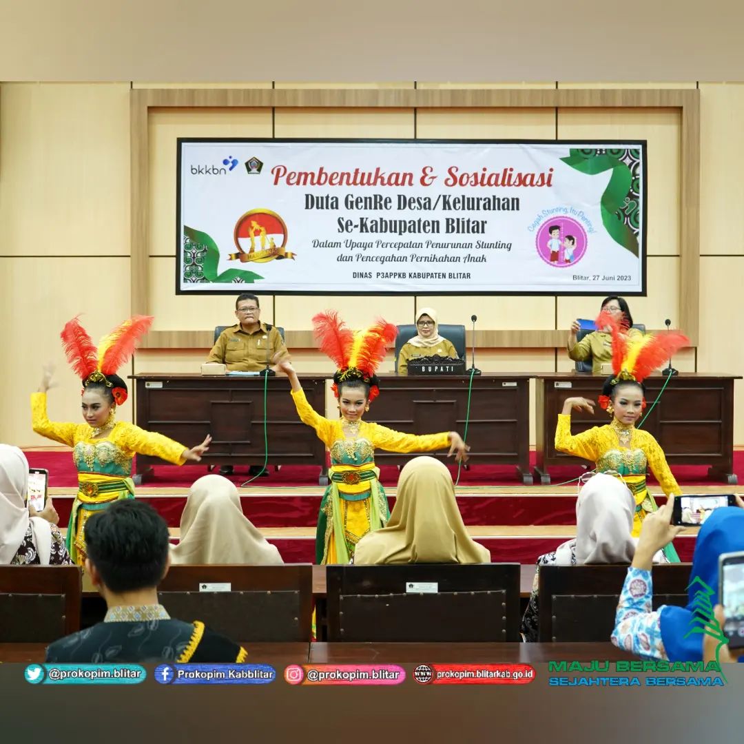 Bupati Blitar Hj. Rini Syarifah menghadiri acara Pembentukan Dan Sosialisasi Duta Generasi Berencana (GENRE) Desa/Kelurahan Se-Kabupaten Blitar Dalam upaya Percepatan Penurunan Stunting Dan Pernikahan Anak, di Kantor Bupati Blitar Kanigoro pada hari Selasa 27 Juni 2023.