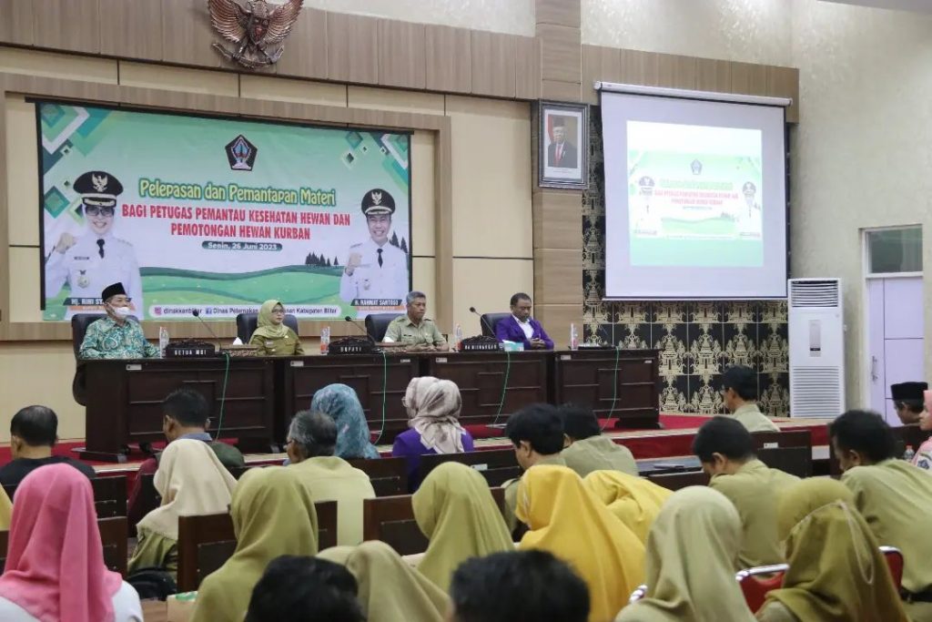 Bupati Blitar Hj. Rini Syarifah menghadiri acara Pelepasan Petugas Pemantau Kesehatan Hewan Qurban Tahun 2023 di Aula Candi Penataran pada Senin, 26 Juni 2023. Acara ini dilaksanakan dalam rangka mengantisipasi resiko penyebaran PMK maupun penyakit kulit berbenjol (Lumpy Skin Disease/LSD) pada perayaan Hari Raya Idul Adha.