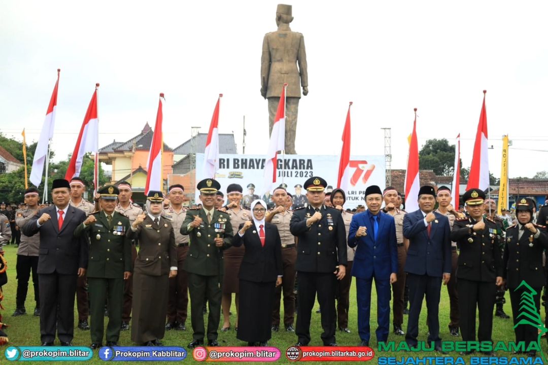 Bupati Blitar, Hj. Rini Syarifah dan Wakil Bupati, H. Rahmat Santoso hadir dalam upacara peringatan Hari Bhayangkara ke-77. Upacara yang diikuti juga oleh Forkopimda, TNI, ASN dan segenap elemen masyarakat ini digelar di Alun-alun Kanigoro pada Sabtu, 1 Juli 2023.