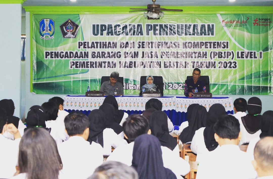 Bupati Blitar, Hj. Rini Syarifah membuka Pelatihan dan Sertifikasi Kompetensi Pengadaan Barang dan Jasa Pemerintah (PBJP) Level 1. Kegiatan yang diikuti 40 ASN Pemkab Blitar ini digelar di Local Education Center pada Selasa, 11 Juli 2023.