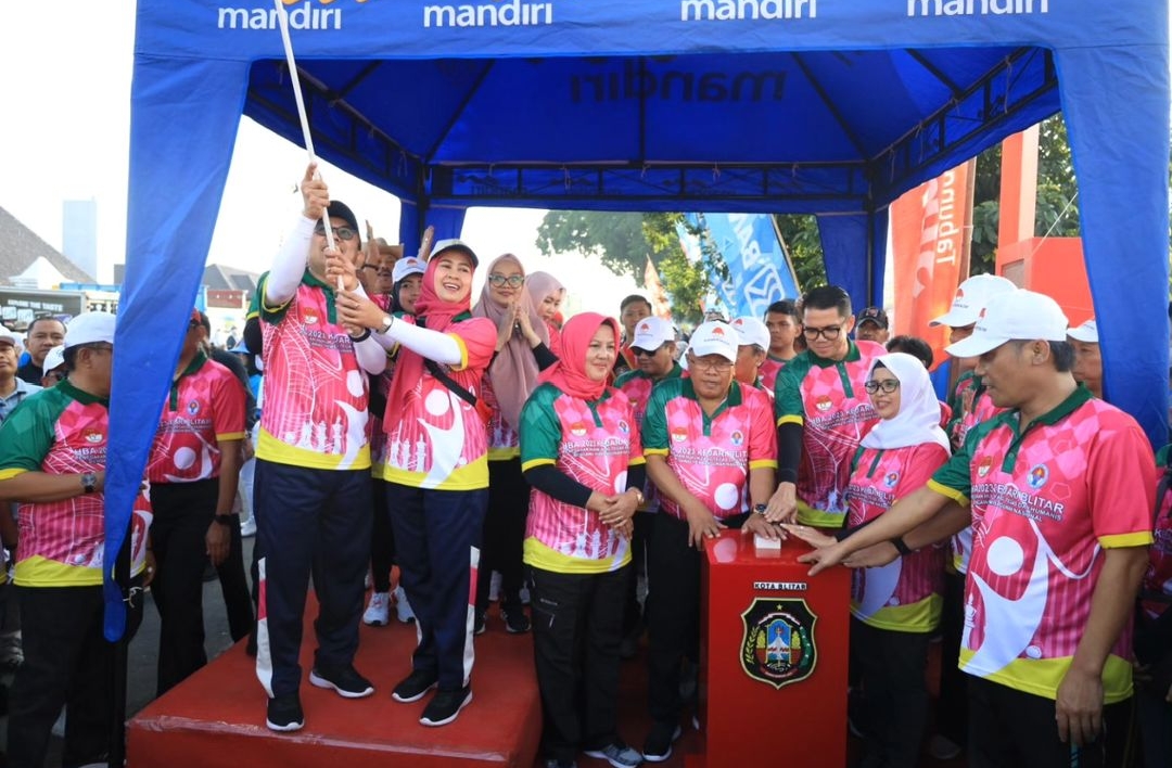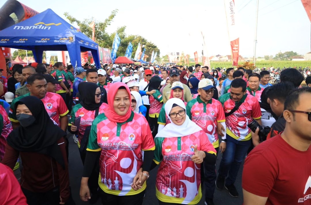 Bupati Blitar, Hj. Rini Syarifah mengikuti jalan sehat dalam rangka Hari Bhakti Adhyaksa ke-63 bersama Forkopimda Blitar Raya. Kegiatan yang diinisiasi Kejaksaan Negeri Blitar ini digelar di Sport Center Kelurahan Bendo Kota Blitar pada Minggu, 16 Juli 2023.