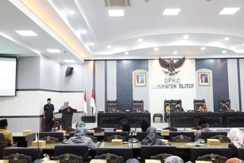 Bupati Blitar Hj. Rini Syarifah menghadiri Rapat Paripurna DPRD Kabupaten Blitar terkait penyampaian penjelasan Bupati tentang Perubahan Kebijakan Umum Anggaran (KUA) dan Perubahan Prioritas Plafon Anggaran Sementara (PPAS) Kabupaten Blitar Tahun 2023 di Gedung Graha Paripurna DPRD pada Senin, 31 Juli 2023.