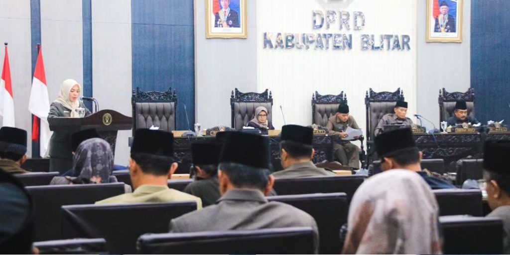 Bupati Blitar Hj. Rini Syarifah menghadiri Rapat Paripurna DPRD Kabupaten Blitar terkait penyampaian laporan Pansus I, II, III, IV, dan V tentang Rancangan Peraturan Daerah (Ranperda) Pajak Retribusi Daerah dan dilanjutkan penandatanganan nota kesepakatan bersama tentang KUA-PPAS tahun anggaran 2024 di Graha Paripurna DPRD Kabupaten Blitar pada hari Jumat 11 Agustus 2023.