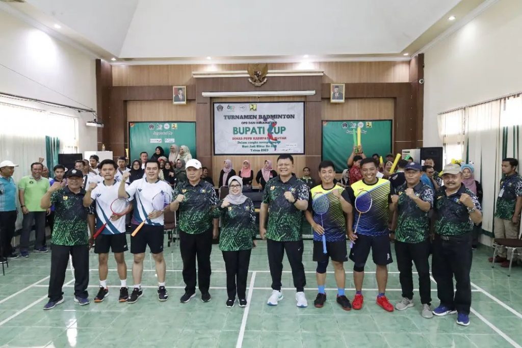 Badminton Bupati Cup 2023 diselenggarakan dalam rangka memperingati Hari Jadi Blitar ke – 699 dan HUT Kemerdekaan RI ke – 78. Mak Rini sapaan akrab Bupati Blitar mengajak semua peserta yang hadir untuk membiasakan pola hidup sehat salah satunya dengan berolahraga yang rutin.