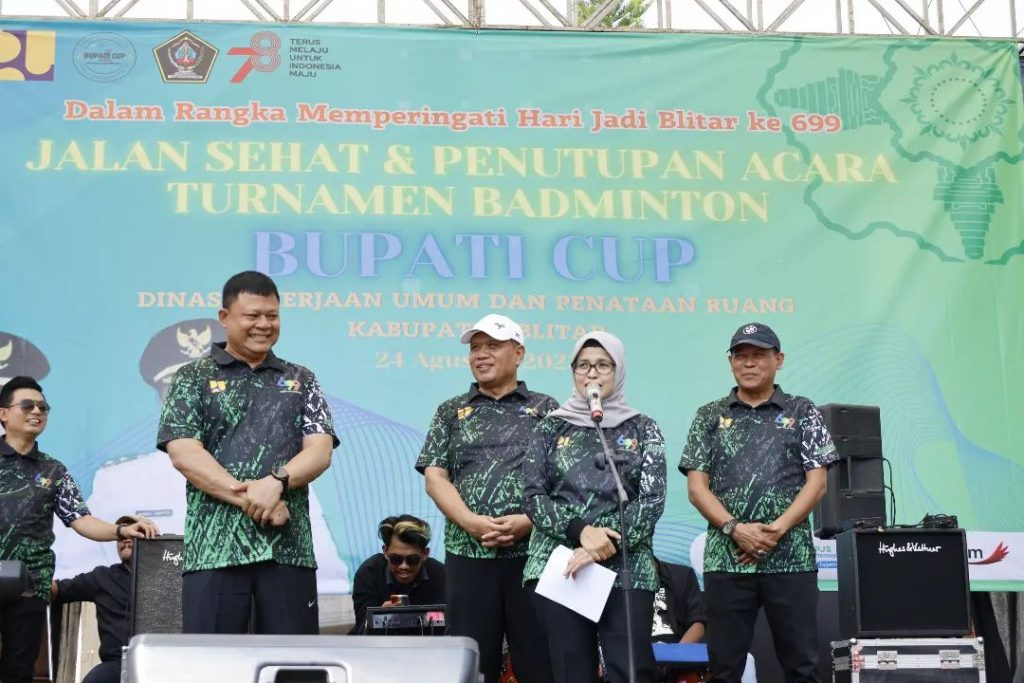 Bupati Blitar Hj. Rini Syarifah menghadiri acara Jalan Sehat & Penutupan Acara Turnamen Badminton Bupati Cup 2023 yang diselenggarakan oleh Dinas PUPR Kabupaten Blitar pada Kamis, 24 Agustus 2023. Acara ini diikuti oleh perwakilan OPD se-Kabupaten Blitar.
