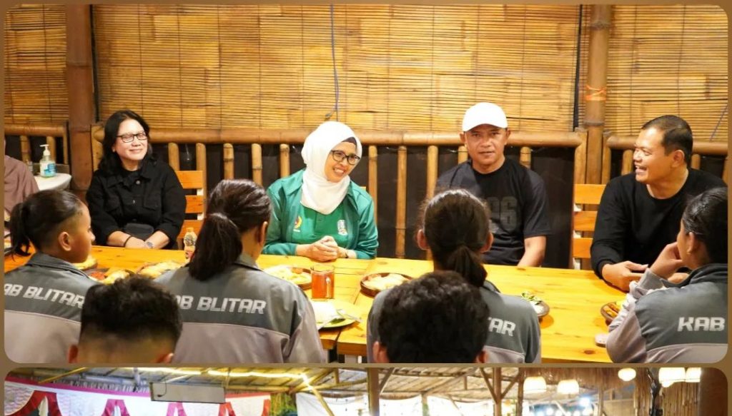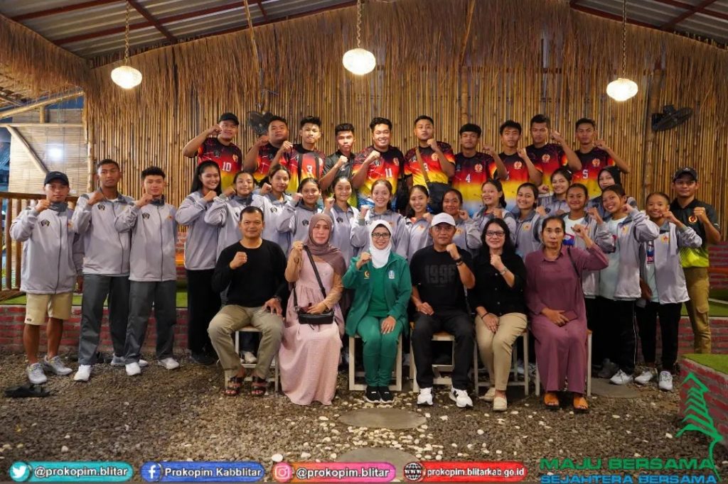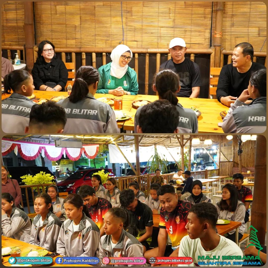 Bupati Blitar Hj. Rini Syarifah beramah tamah dengan para Atlet Kabupaten Blitar, sebelum menghadiri Pembukaan Porprov Jawa Timur VIII – 2023 yang dilaksanakan di Stadioan Gelora Delta Sidoarjo (GDS) Sidoarjo, hari Sabtu 9 September 2023.