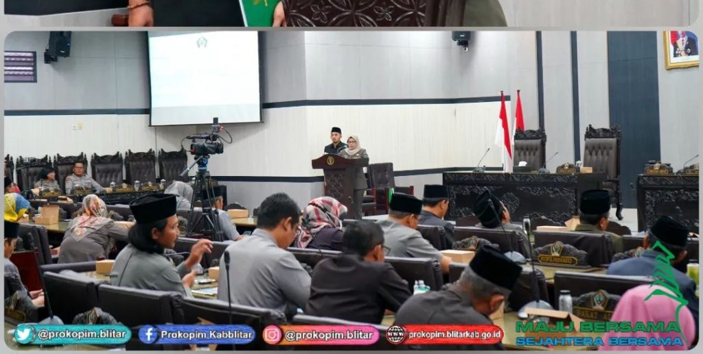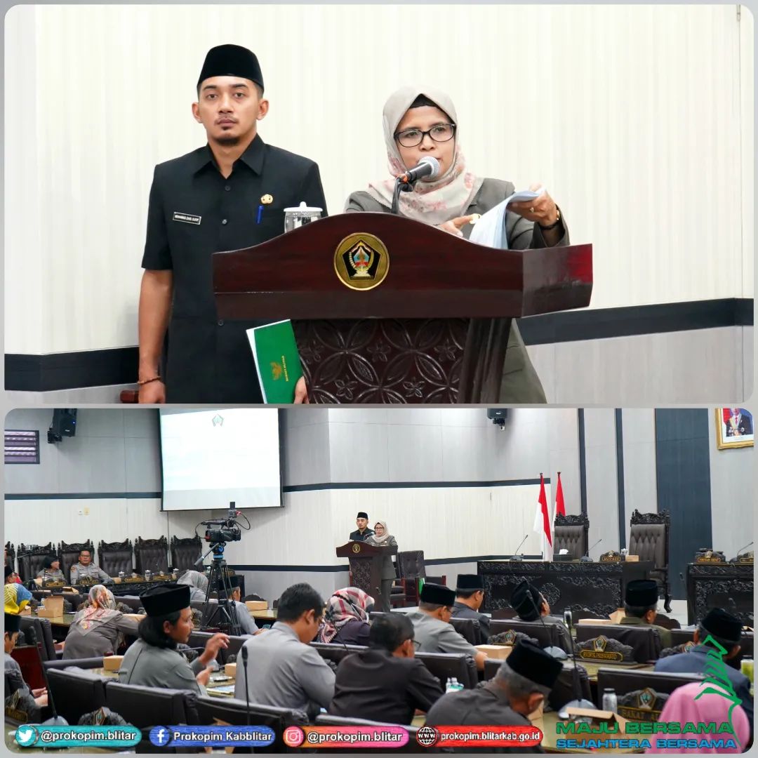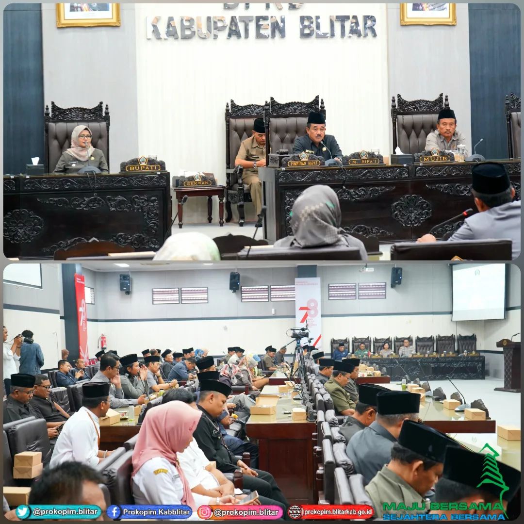 Bupati Blitar Hj. Rini Syarifah menghadiri Sidang Paripurna DPRD, dengan agenda Jawaban Bupati Blitar Atas Pandangan Umum Fraksi-Fraksi Dalam Rapat Paripurna DPRD Kabupaten Blitar Terhadap Nota Keuangan Tentang Rancangan Peraturan Daerah Tentang APBD Kabupaten Blitar Tahun Anggaran 2024, di Graha DPRD Kabupaten Blitar, Rabu 18 Oktober 2023.