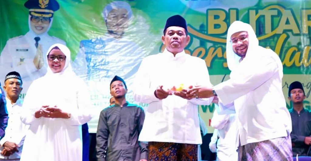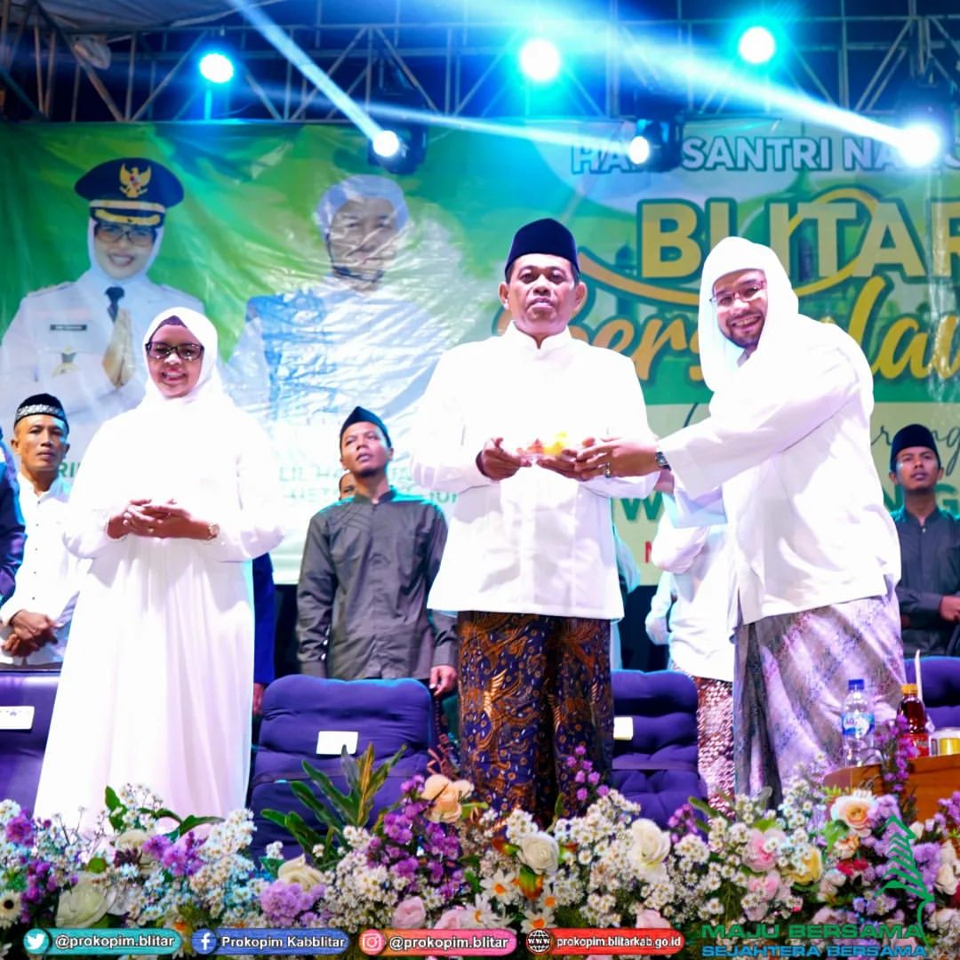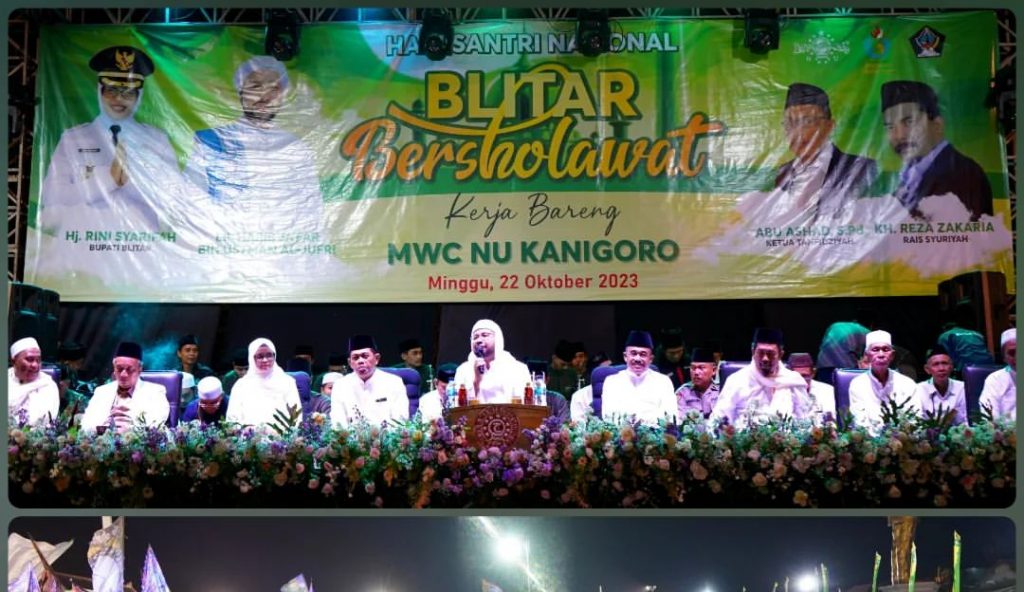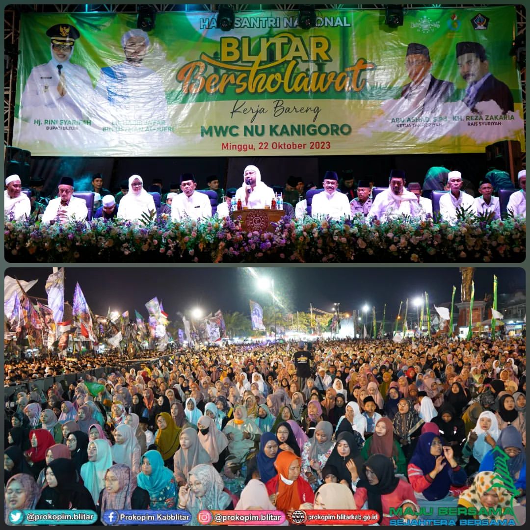 Bupati Blitar Hj. Rini Syarifah menghadiri acara Blitar Bersholawat dalam rangka Peringatan Hari Santri Nasional Tahun 2023 bersama Habib Ja’far Bin Ustman Al Jufri, di Alun-Alun Kanigoro pada Hari Minggu 22 Oktober 2023.