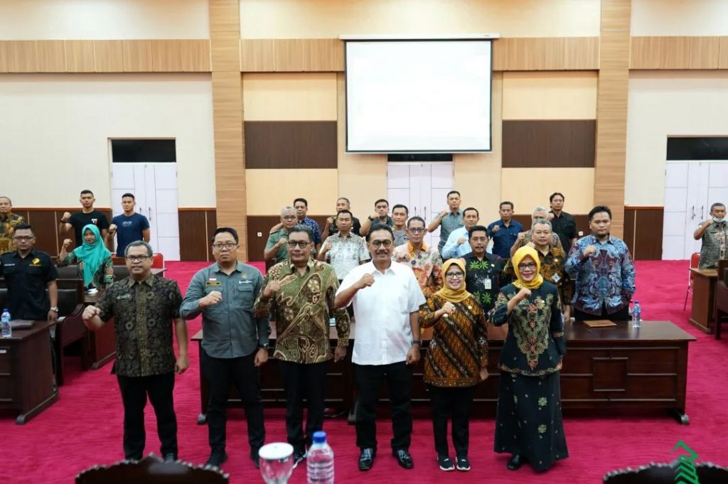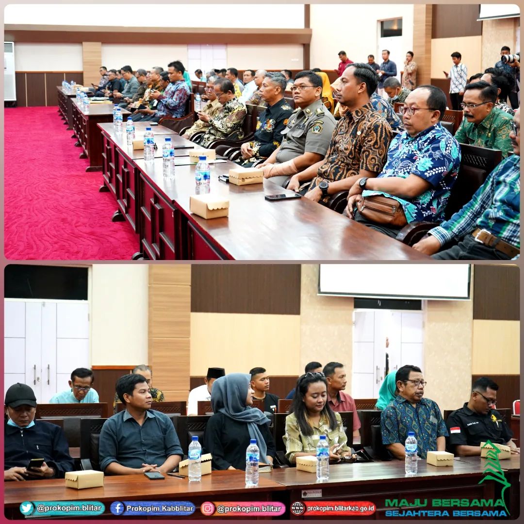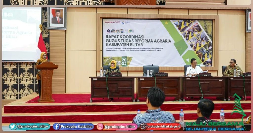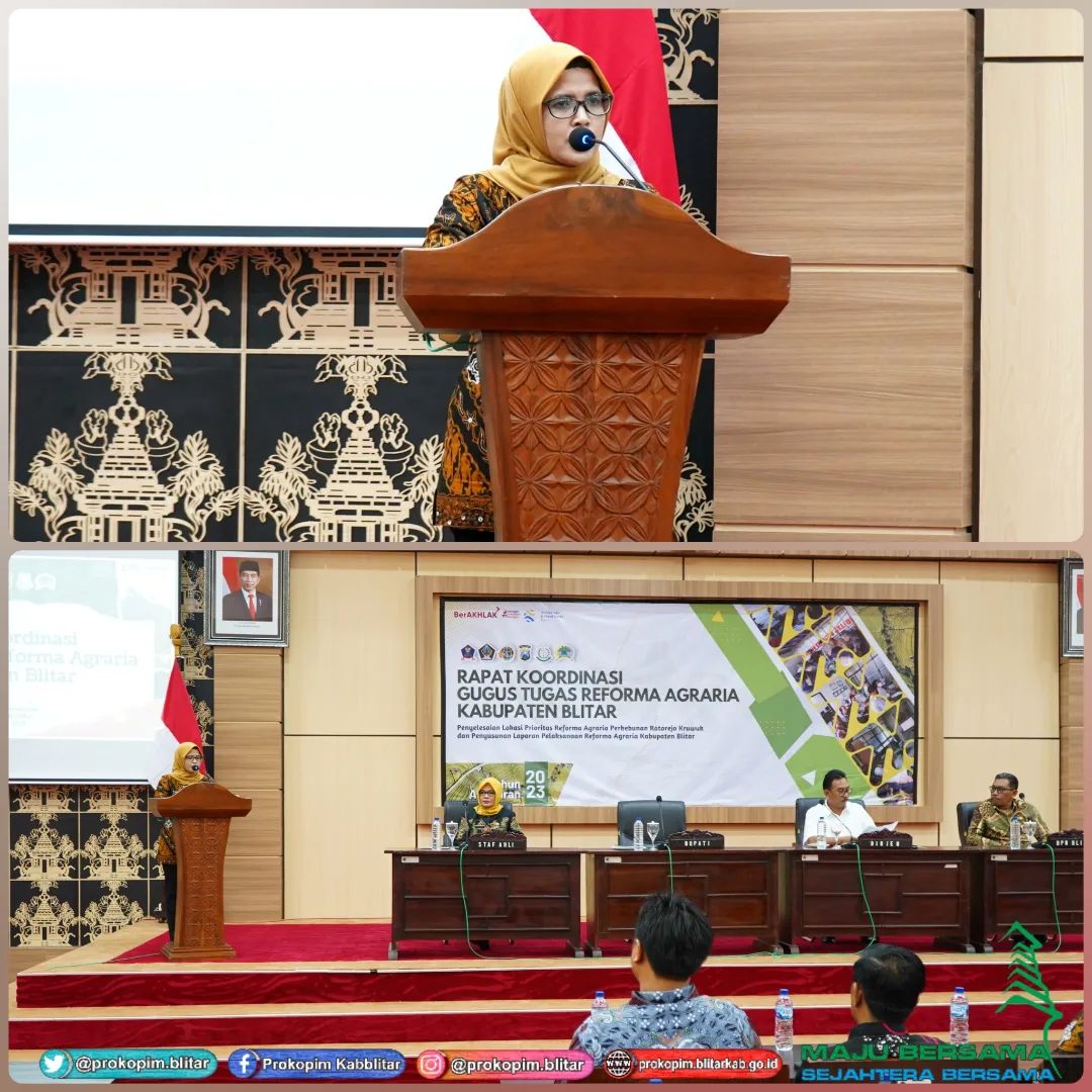 Bupati Blitar Hj. Rini Syarifah menghadiri Rapat Koordinasi Gugus Tugas Reforma Agraria Kabupaten Blitar di Kantor Bupati Blitar Kanigoro, Kamis 26 Oktober 2023. Kegiatan tersebut juga dihadiri oleh Dirjen Penataan Agraria Kementerian Agraria dan Tata Ruang/Badan Pertanahan Nasional Dr. Drs. Dalu Agung Darmawan, M.Si, Kepala BPN Kabupaten Blitar, OPD, dan Warga.