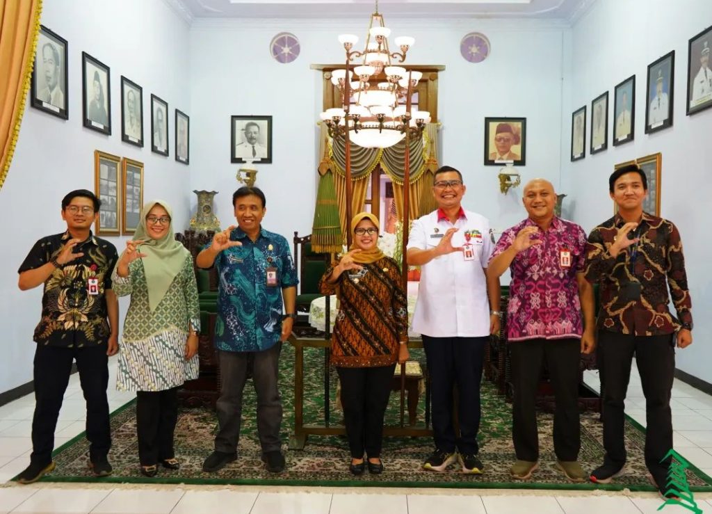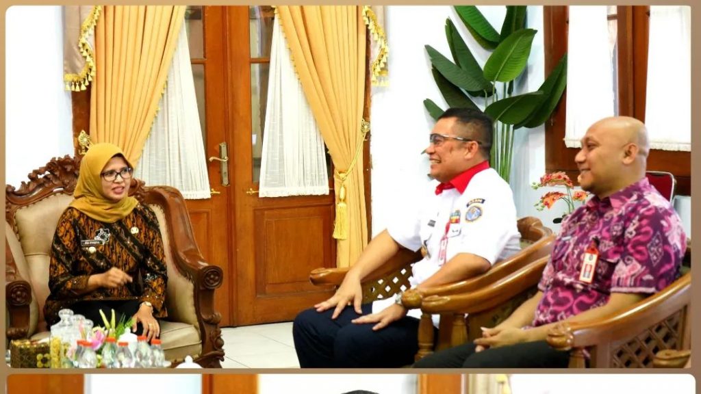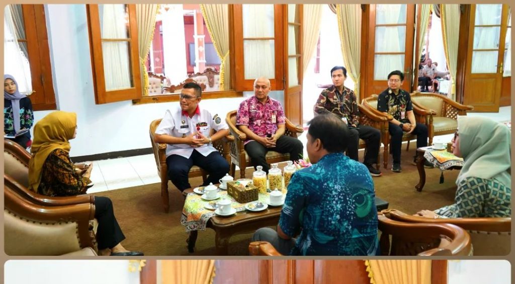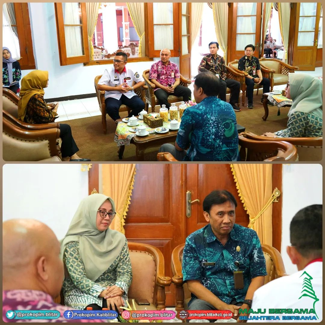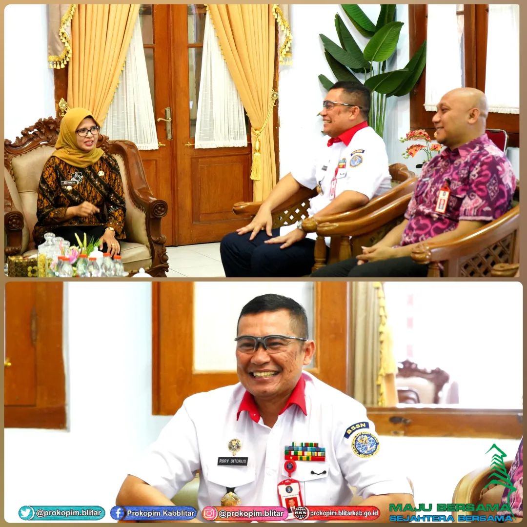 Bupati Blitar Hj. Rini Syarifah didampingi Kepala Dinas Kominfo Kabupaten Blitar menerima kunjungan dari Kepala Pusat Pengembangan Sumber Daya Manusia Badan Siber dan Sandi Negara (BSSN), Brigjen (TNI) Rory Ojak Halomoan Sitorus, S.I.P., M.Si.(Han), M.H.I. di Pendopo Ronggo Hadinegoro, Kamis 26 Oktober 2023.