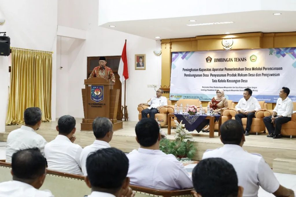 Rektor UNISMA Prof. Dr. H. Maskuri, M.Si selaku narasumber menyampaikan pelaksanaan bimtek Peningkatan Kapasitas dan Kompetensi bagi Aparatur Kepala Desa dan BPD se – Kabupaten Blitar merupakan langkah bersama untuk menjalin kerjasama menghasilkan pembangunan yang berkesinambungan.