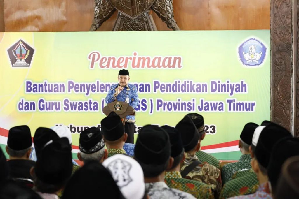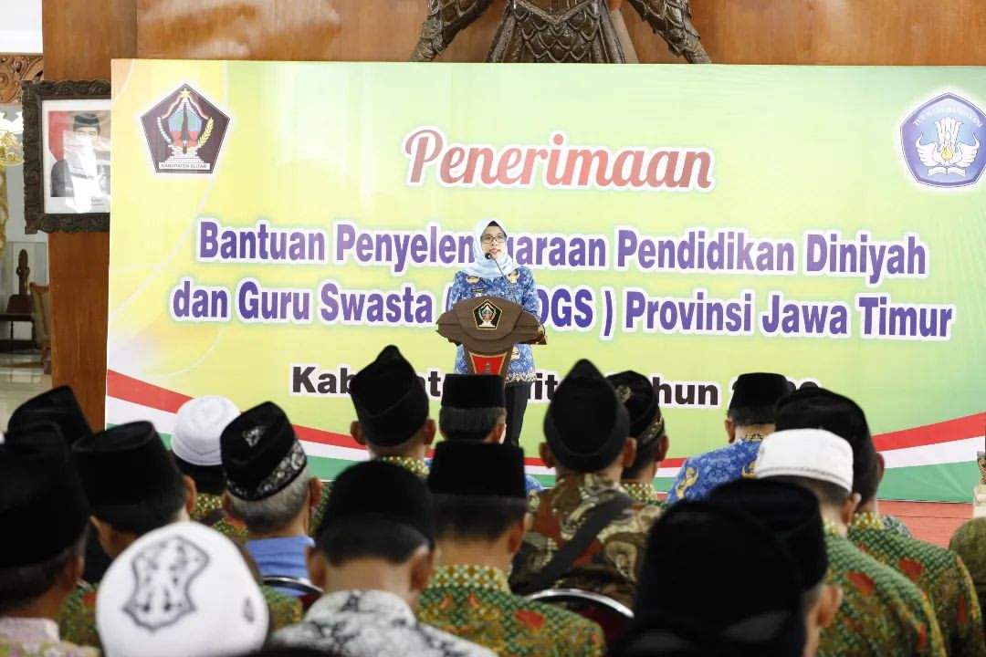 Kepala Dinas Pendidikan Kabupaten Blitar drh. Adi Andaka melaporkan ada sekitar 900 Guru Madin atau swasta dan penyelenggara Diniyah yang hadir di Pendopo Ronggo Hadinegoro. Pendidikan Diniyah dan Guru Swasta (BPPDGS) ini adalah ikon Gubernur Jawa Timur dan sudah dilaksanakan bersama Pemerintah Daerah Kabupaten/Kota se-Jawa Timur sejak Tahun 2010. Program BPPDGS ini bermaksud memberikan bantuan biaya operasional untuk memotivasi dan meningkatkan kesejahteraan guru/ustad.