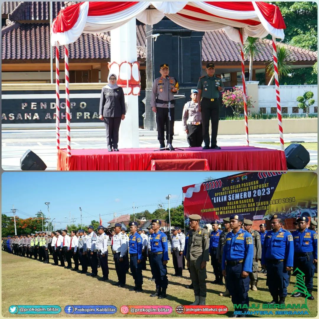 Bupati Blitar Hj. Rini Syarifah menghadiri Apel Gelar Pasukan Operasi Kepolisian Terpusat “Lilin Semeru 2023” di Alun-Alun Kanigoro hari Kamis 21 Desember 2023. Apel yang dipimpin oleh Kapolres Blitar ini Dalam Rangka Perayaan Natal Dan Tahun Baru 2023 di Wilayah Kabupaten Blitar.