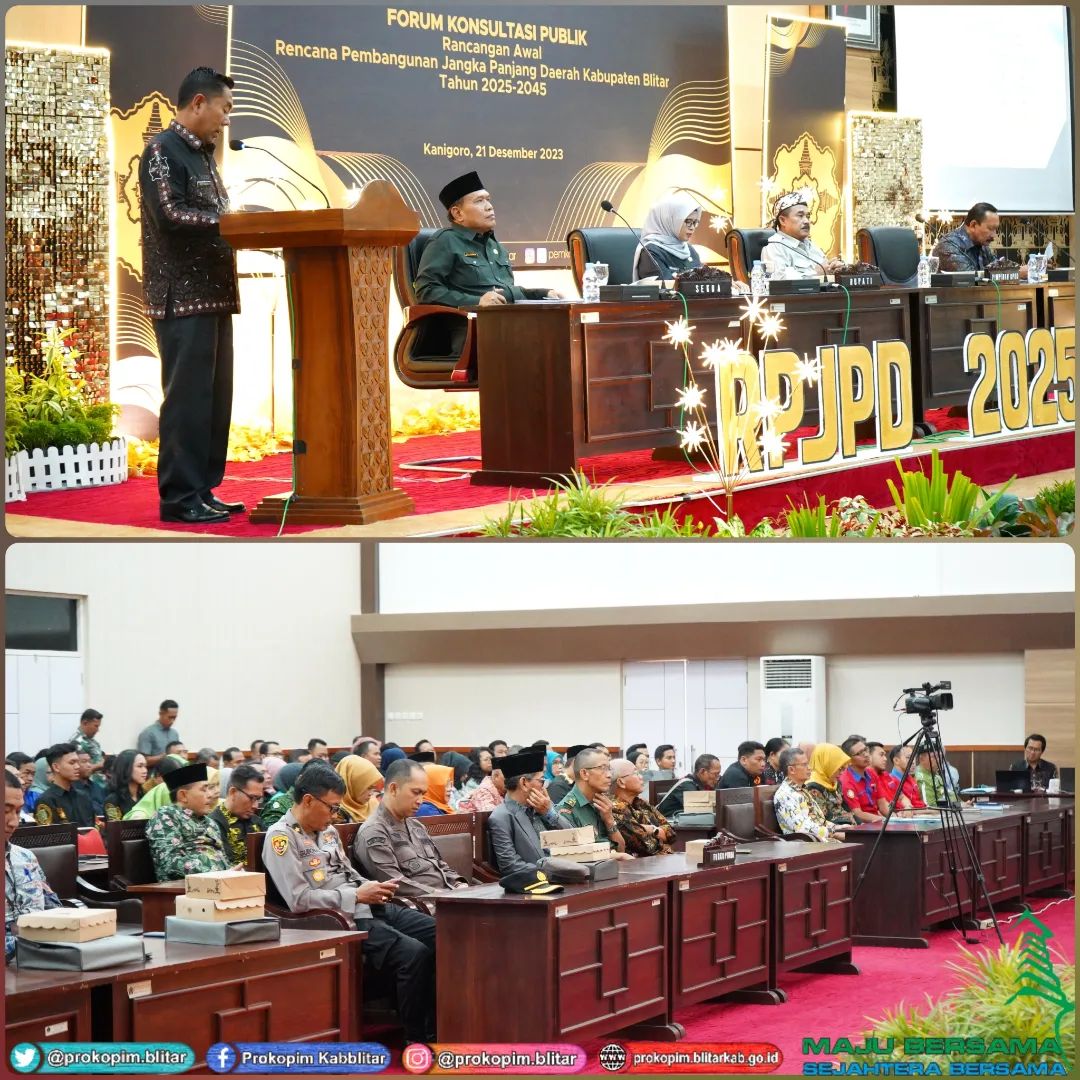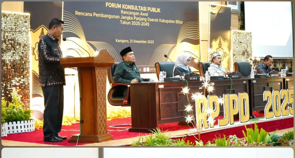 Hal tersebut disampaikan oleh Bupati Blitar Hj. Rini Syarifah saat membuka acara Forum Konsultasi Publik Rancangan Awal (Ranwal) Rencana Pembangunan Jangka Panjang Daerah (RPJPD) Kabupaten Blitar Tahun 2025-2045 di Ruang Rapat Candi Penataran , Kamis 21 Desember 2023.