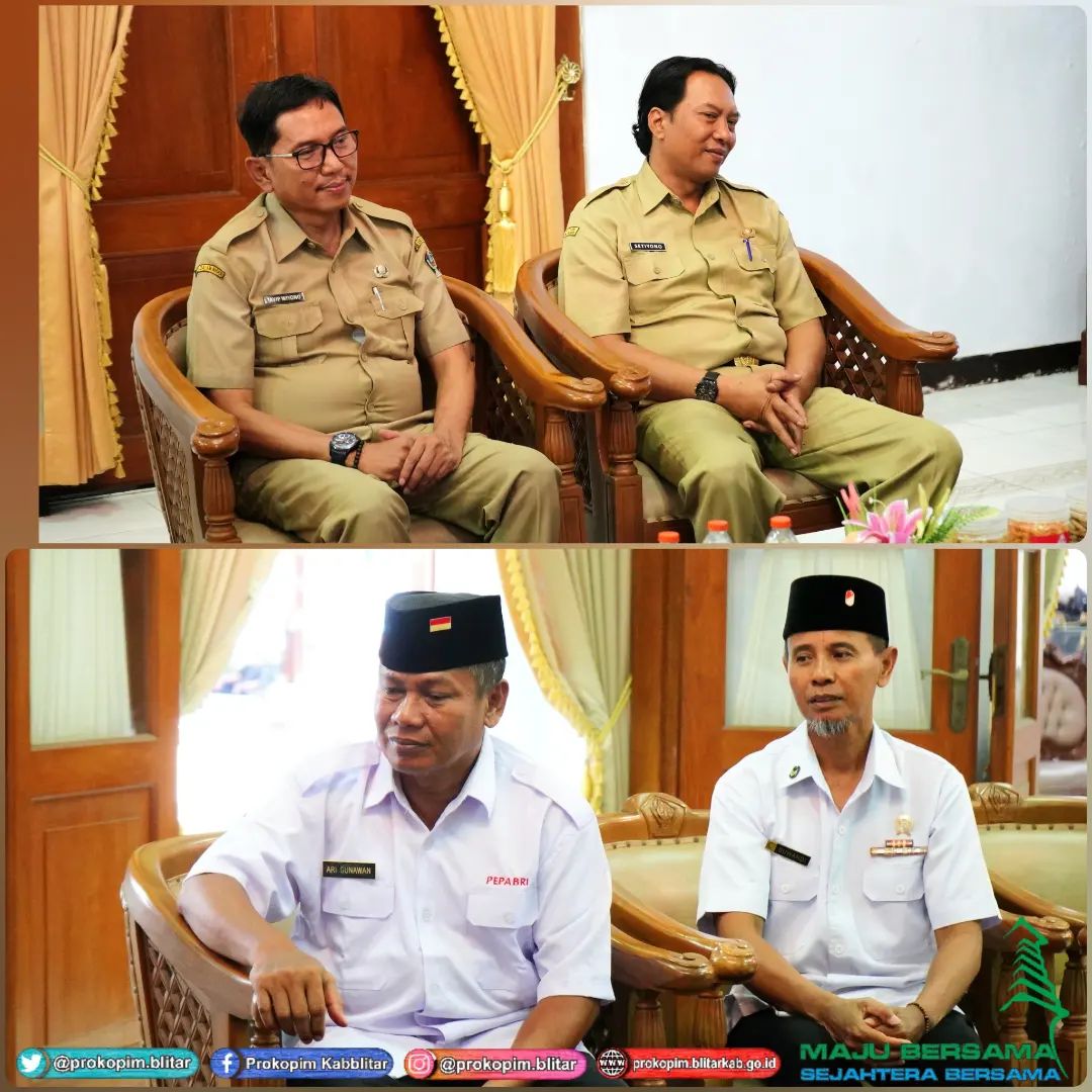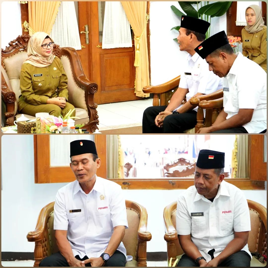 Bupati Blitar Hj. Rini Syarifah menerima kunjungan dari Pepabri di Pendopo Ronggo Hadinegoro, Selasa 16 Januari 2023. Pada audiensi ini turut hadir Kepala Bakesbangpol dan Plt. Kepala Dinas Sosial Kabupaten Blitar.