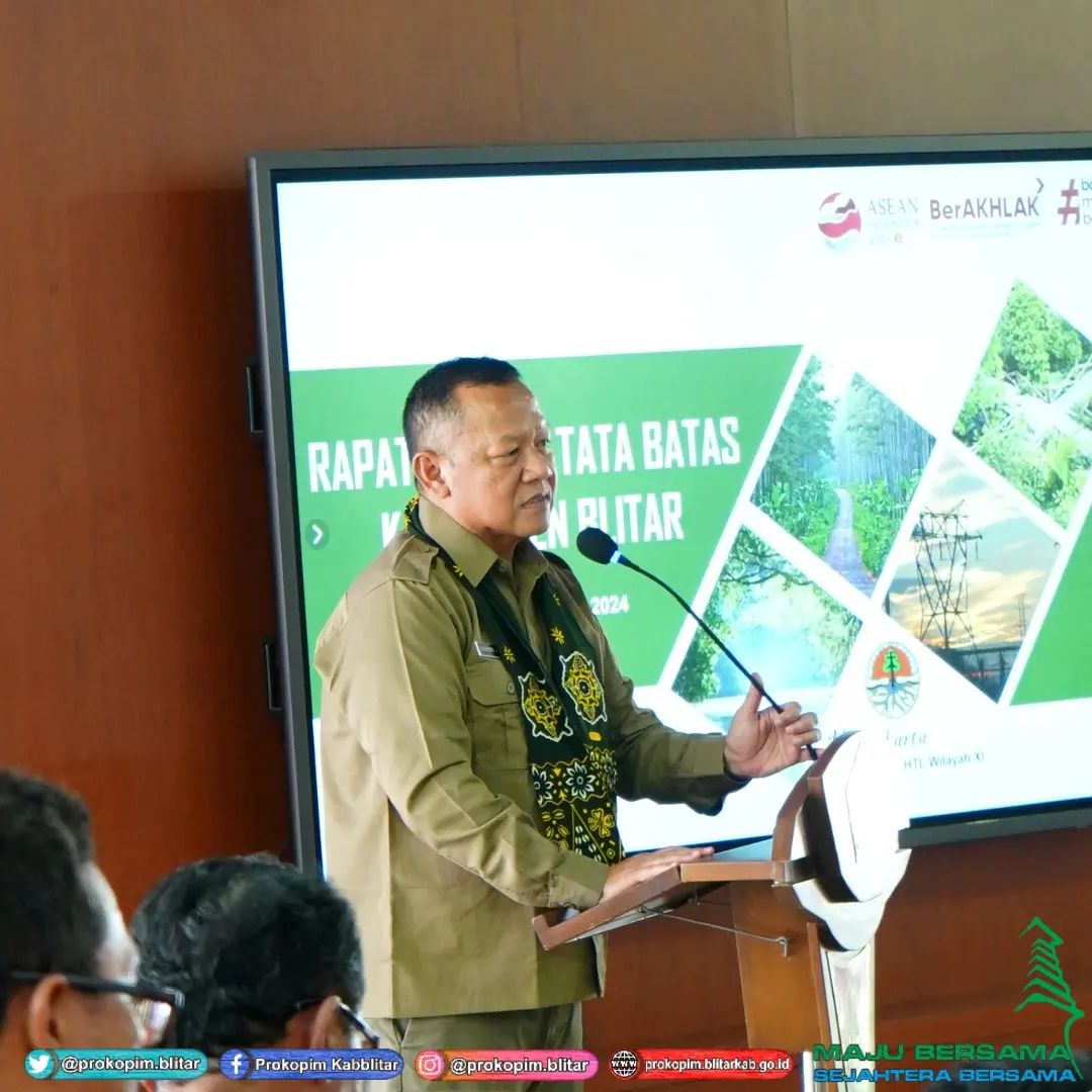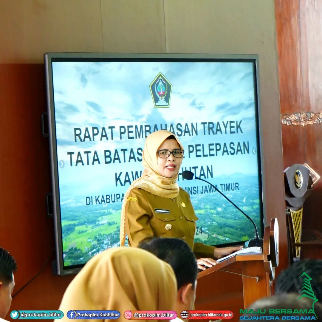 Bupati Blitar Hj. Rini Syarifah membuka Rapat Pembahasan Trayek Tata Batas Areal Persetujuan Pelepasan Kawasan Hutan di Kabupaten Blitar. Kegiatan ini dihadiri Sekretaris Daerah, OPD, Camat, Kepala Desa, Kepala BPN, dan Kepala Balai Pemantapan Kawasan Hutan dan Tata Lingkungan XI (BPKHTL) Yogyakarta, dan berlangsung di Pendopo Ronggo Hadinegoro, 22 Januari 2024.