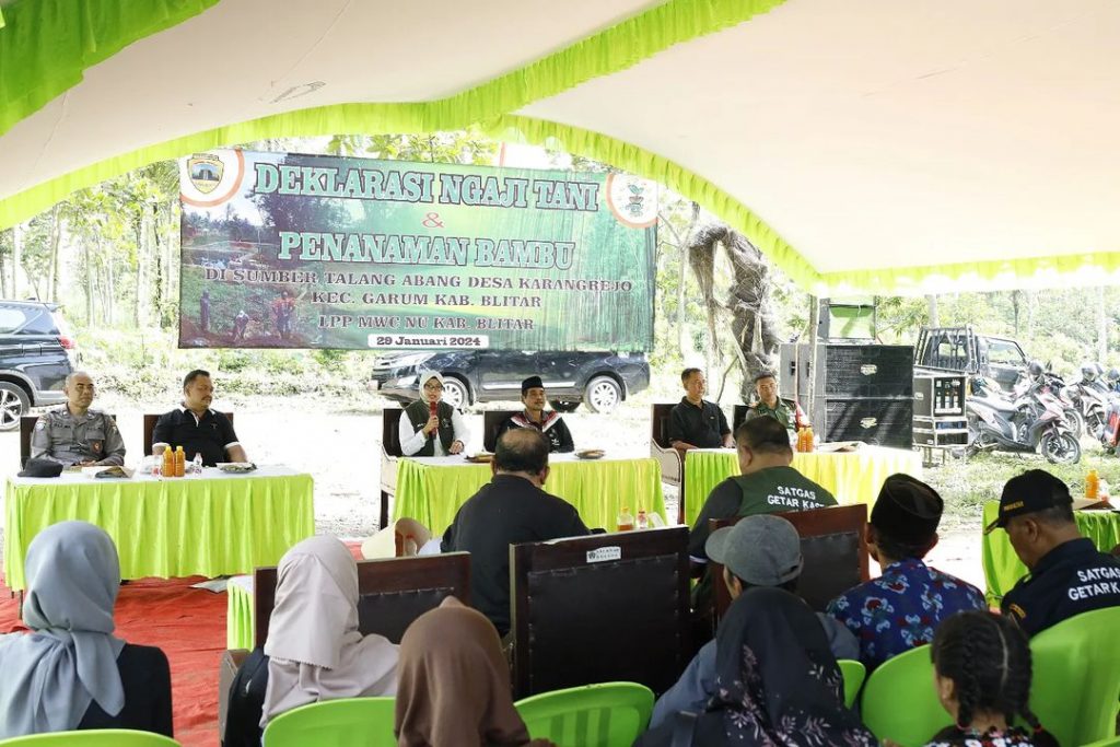 Bupati Blitar Hj. Rini Syarifah menghadiri kegiatan Deklarasi “Ngaji Tani” dan Penanaman Bambu di Sumber Talang Abang Desa Karangrejo Kecamatan Garum pada Senin, 29 Januari 2024. Kegiatan ini diselenggarakan oleh LPP MWC NU Kabupaten Blitar bekerjasama dengan Pemerintah.