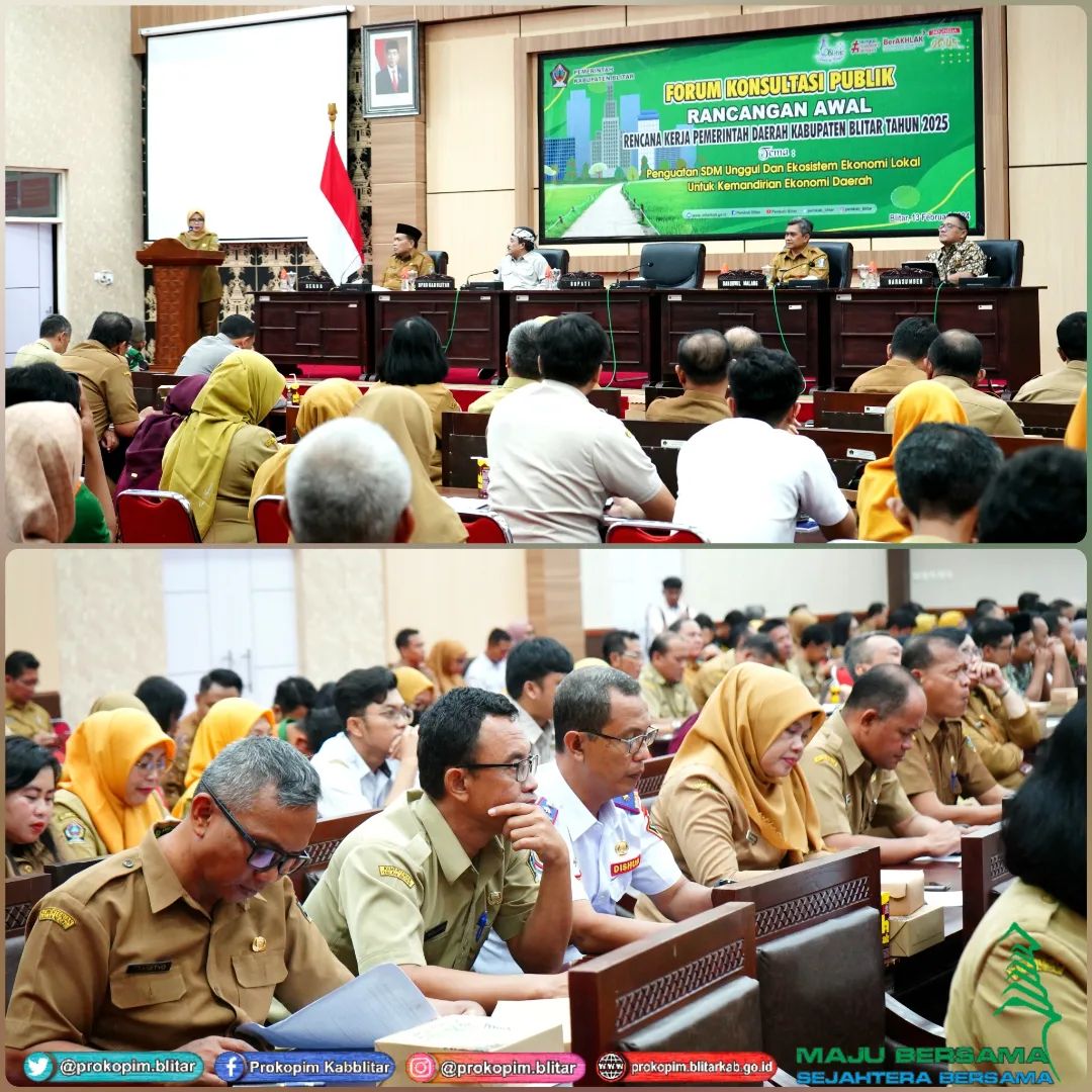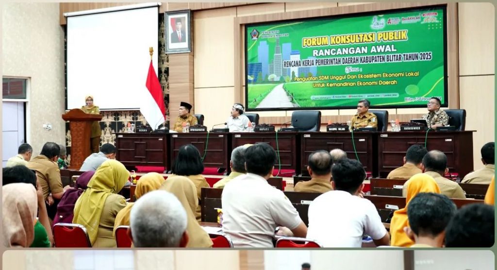 Hal itu disampaikan oleh Bupati Blitar Hj. Rini Syarifah saat membuka kegiatan Konsultasi Publik Rancangan Awal Rencana Kerja Pemerintah Daerah (Ranwal RKPD) Kabupaten Blitar Tahun 2025 dengan tema “Penguatan SDM Unggul Dan Ekosistem Ekonomi Lokal Untuk Kemandirian Ekonomi Daerah”. Kegiatan yang berlangsung di Ruang Rapat Candi Penataran hari ini dihadiri Kepala Bakorwil III Malang, Sdr. Asep Kusdinar, S.Hut., M.H, Wakil Ketua DPRD, OPD, Camat, Asosiasi Profesi dan Direktur Badan Usaha di Kabupaten Blitar.