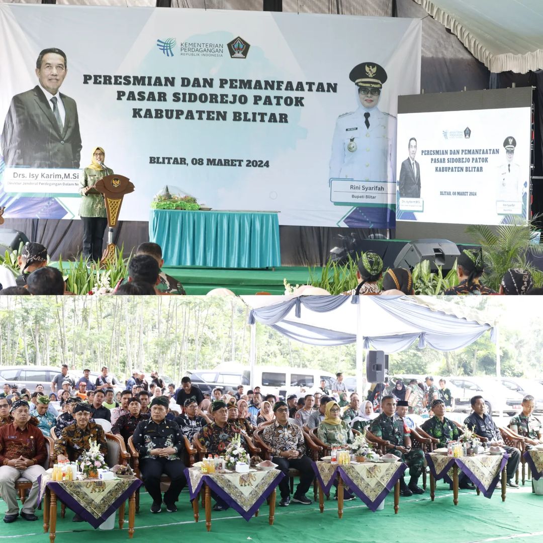 Mak Rini sapaan akrab Bupati Blitar menyampaikan apresiasi atas kehadiran Dirjen PDN Kementerian Perdagangan bersama tim yang mewakili Pak Menteri Perdagangan meresmikan Pasar Sidorejo Patok. Mak Rini juga mengucapkan Terima kasih telah memberikan fasilitasi pembangunan fisik Pasar Sidorejo melalui Dana Tugas Pembantuan Kementerian Perdagangan Republik Indonesia Tahun Anggaran 2023.