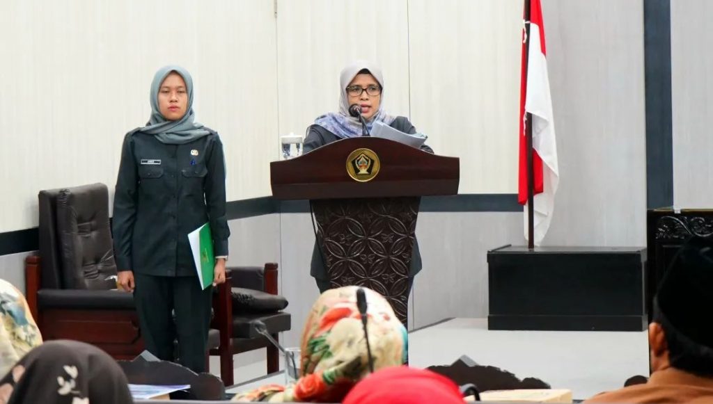 Bupati Blitar Hj. Rini Syarifah menyampaikan Laporan Keterangan Pertanggung Jawaban (LKPJ) Tahun 2023 dalam sidang Paripurna DPRD Kabupaten Blitar di Graha DPRD Kabupaten Blitar, Jumat 15 Maret 2024.