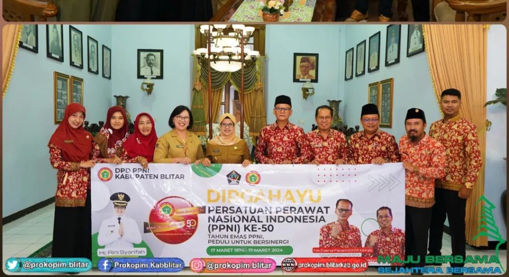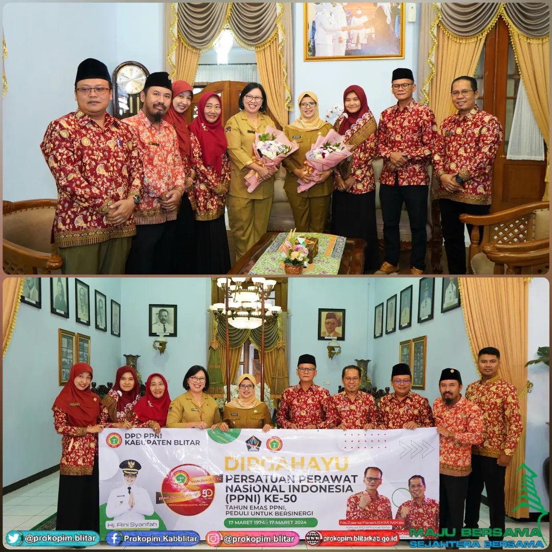 Dalam rangka Ulang Tahun ke-50, Persatuan Perawat Nasional Indonesia (PPNI) bersilaturahmi dengan Bupati Blitar Hj. Rini Syarifah. Audiensi tersebut berlangsung di Pendopo Ronggo Hadinegoro, Selasa 19 Maret 2024.