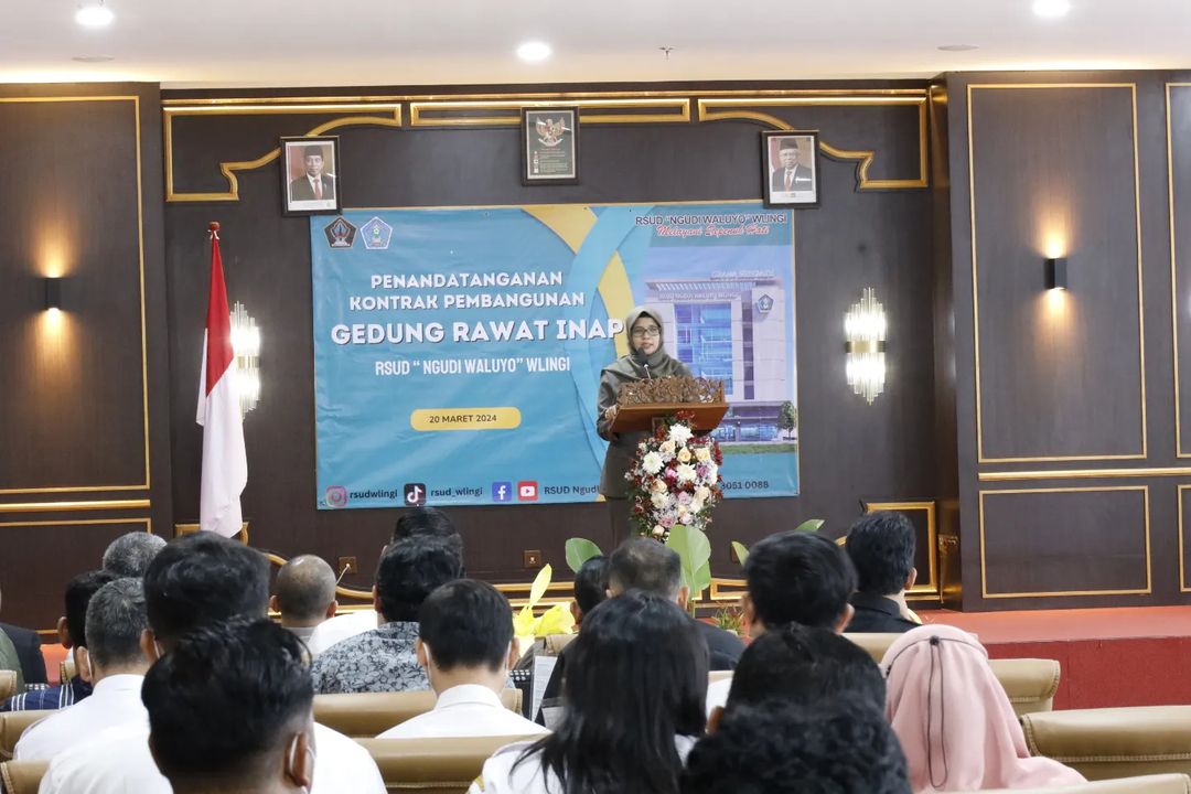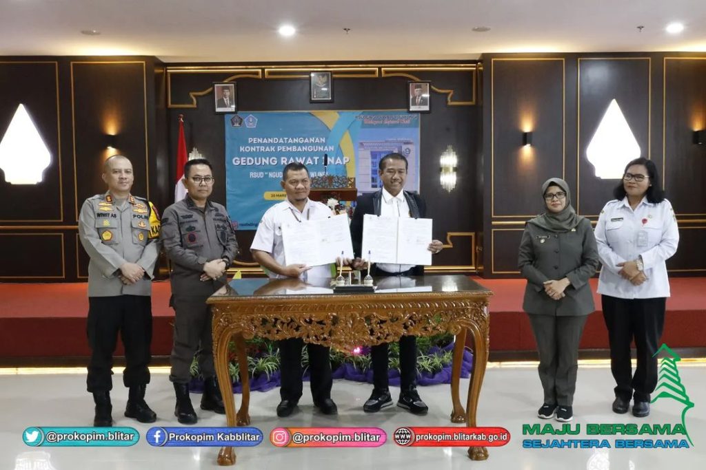 Bupati Blitar Hj. Rini Syarifah menghadiri acara Penandatanganan Kontrak Pembangunan Gedung Rawat Inap RSUD “Ngudi Waluyo” Wlingi yang bertempat di Hall Gatotkaca pada Rabu, 20 Maret 2024. Proses pembangunan Gedung Rawat Inap 8 (delapan) lantai ini sudah memasuki tahap penandatanganan kontrak antara manajemen RSUD Wlingi dengan pihak kontraktor pemenangan tender.