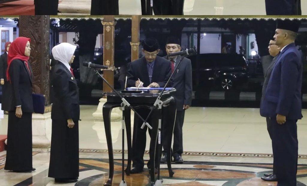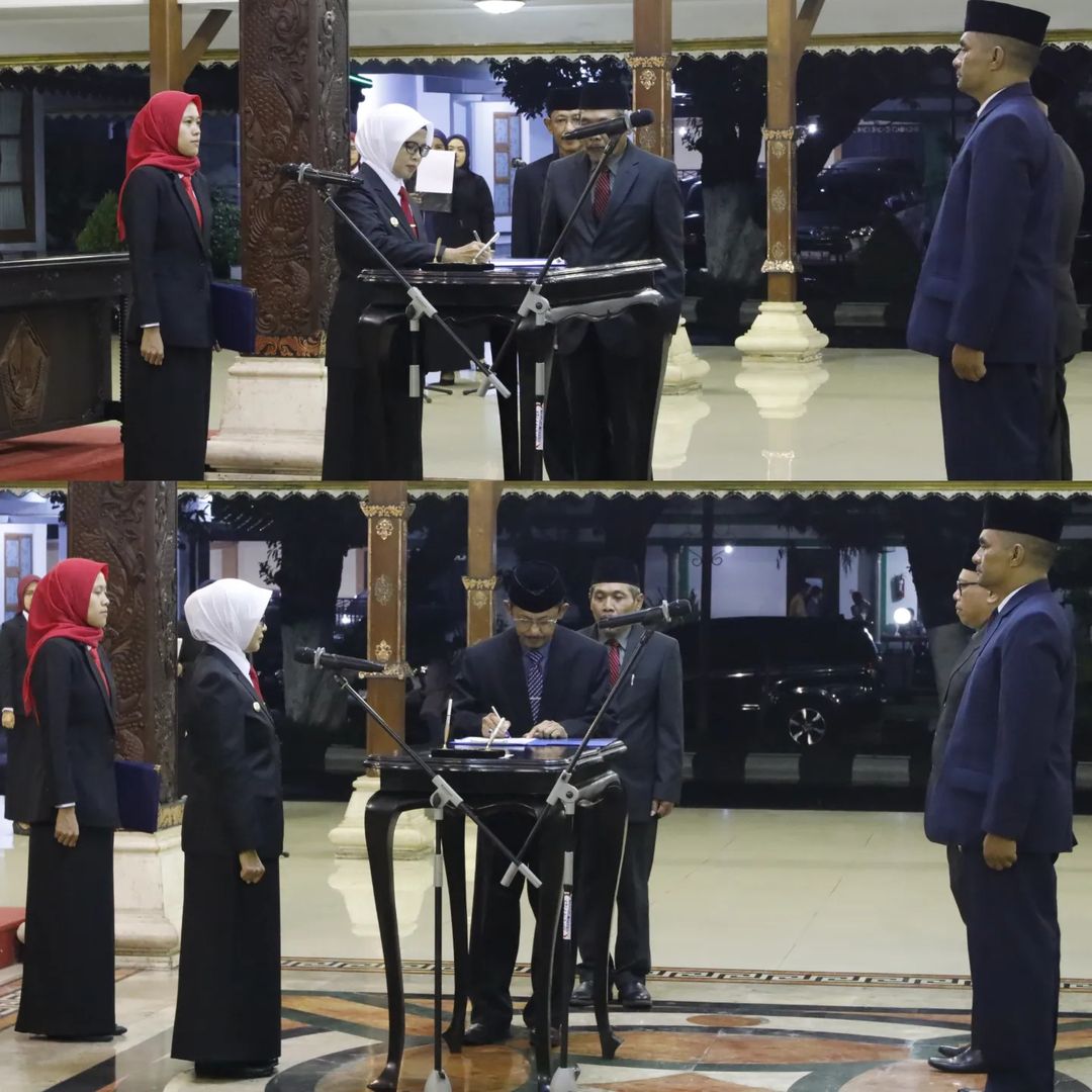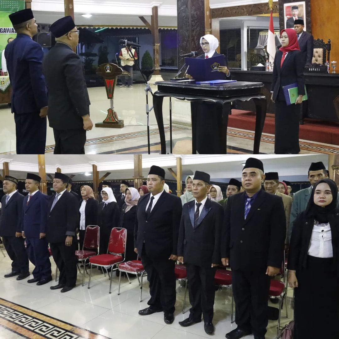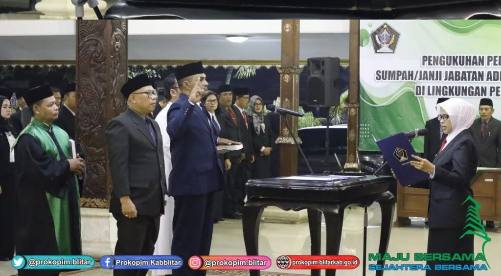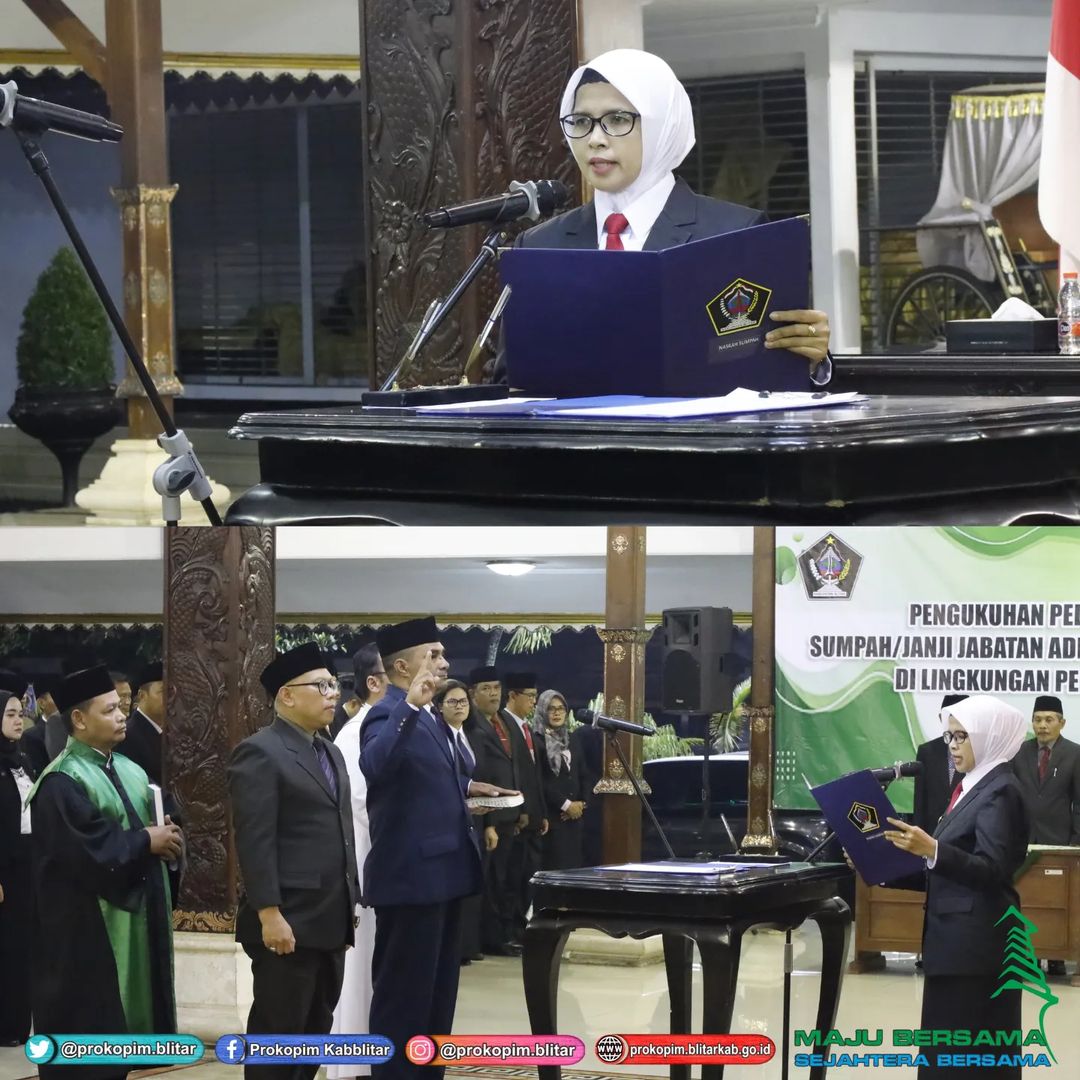 Bupati Blitar Hj. Rini Syarifah melaksanakan Pengukuhan Pelantikan dan Pengambilan Sumpah / Janji Jabatan Administrator dan Jabatan Pengawas di Lingkungan Pemerintah Kabupaten Blitar pada Kamis, 21 Maret 2024 bertempat di Pendopo Ronggo Hadinegoro.