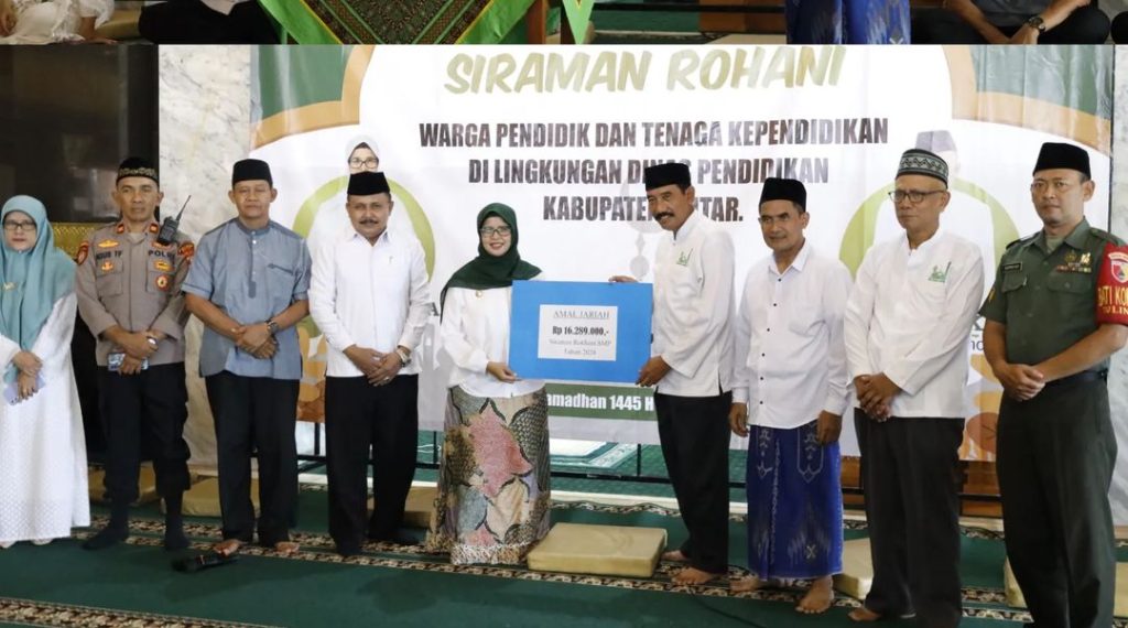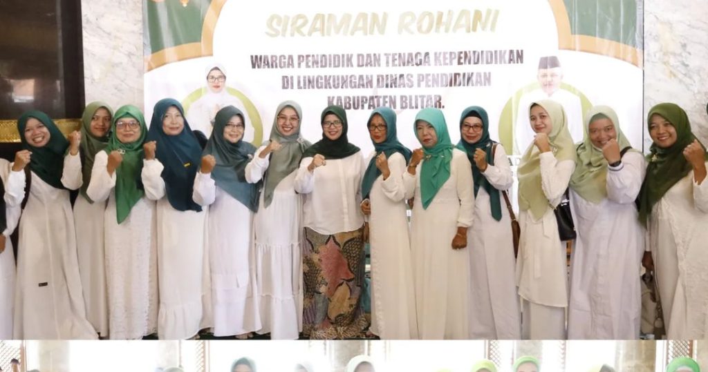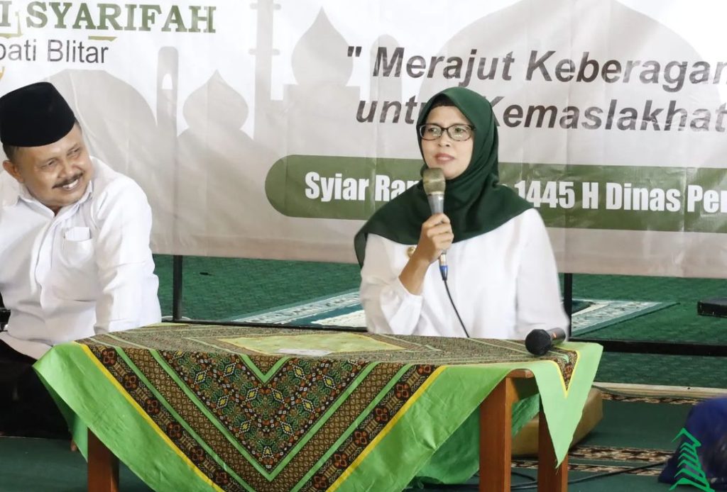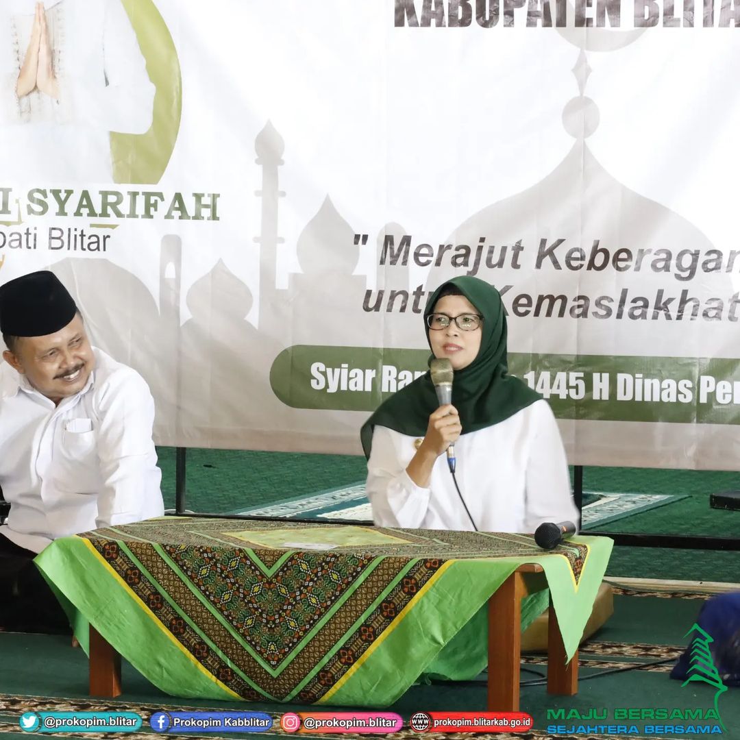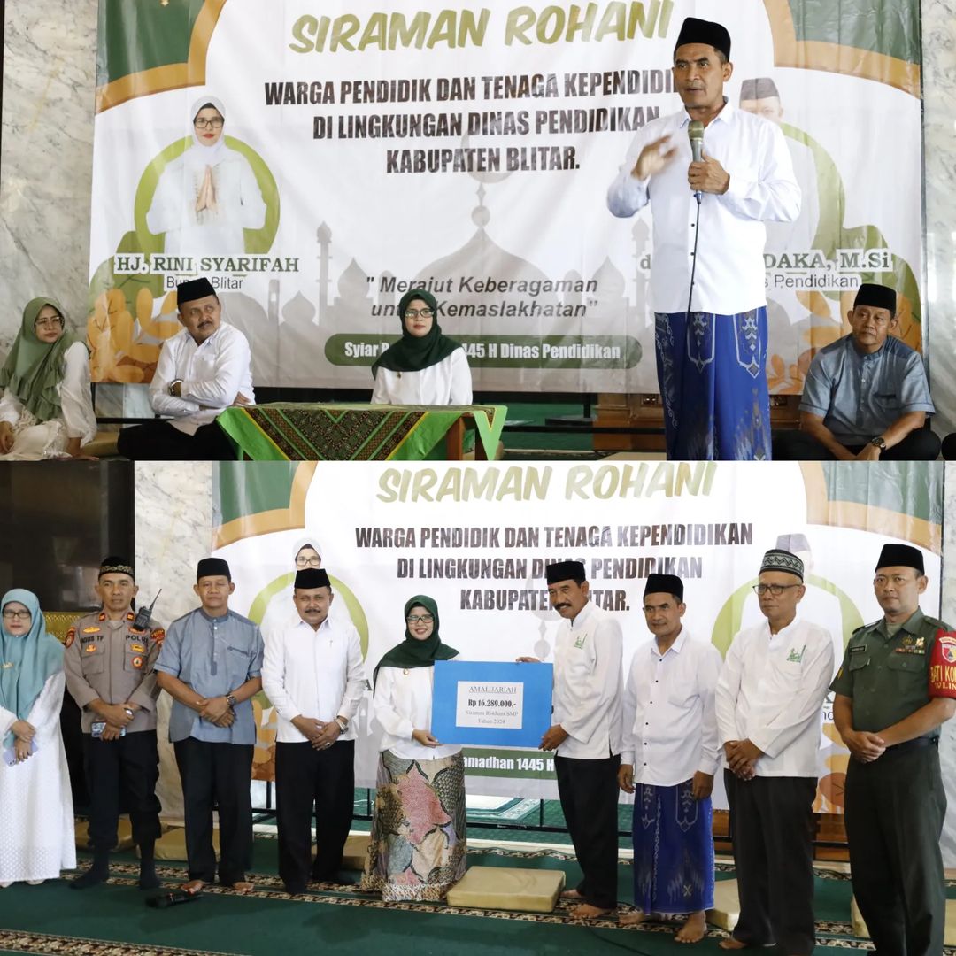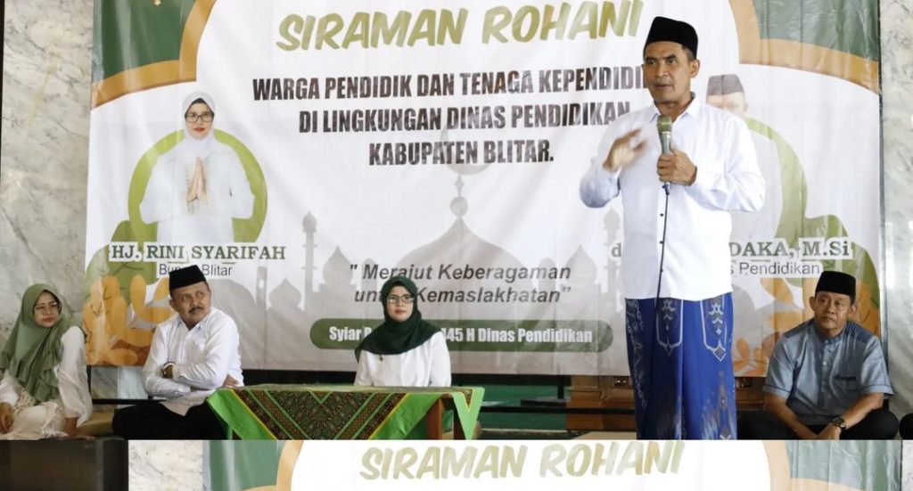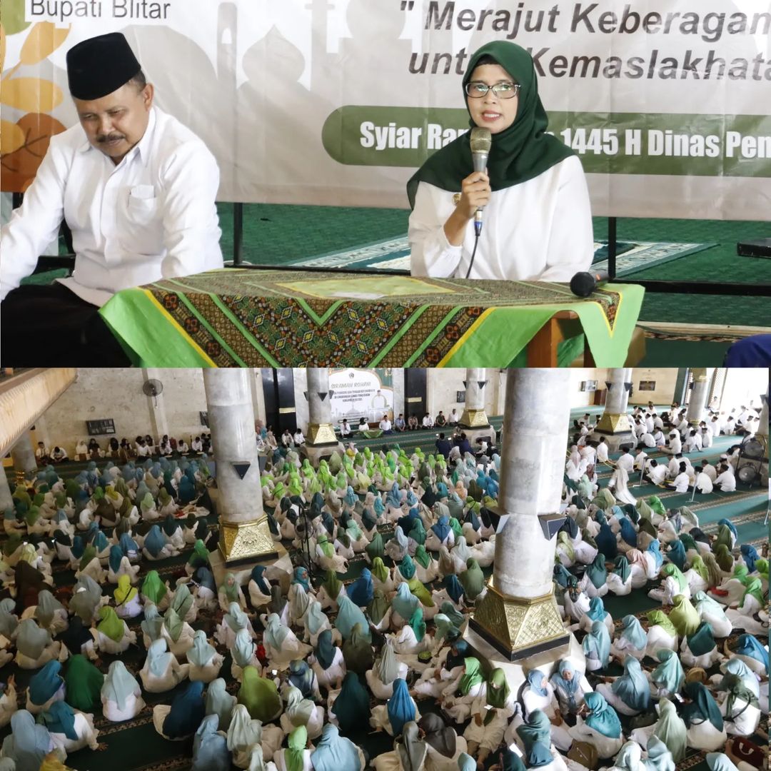 Bupati Blitar Hj. Rini Syarifah menghadiri acara Siraman Rohani bagi Warga Pendidik dan Tenaga Kependidikan di Lingkungan Dinas Pendidikan Kabupaten Blitar pada Senin, 1 April 2024. Siraman Rohani ini diikuti oleh guru SMP, pengawas dan staf Dinas Pendidikan bertempat di Masjid Miftahul Jannah Wlingi.