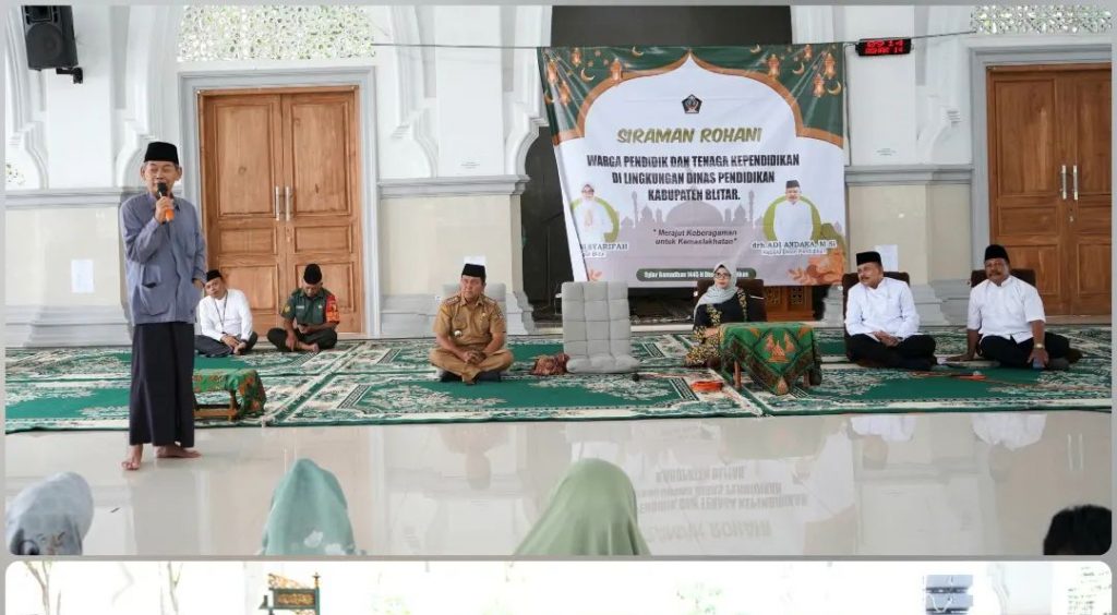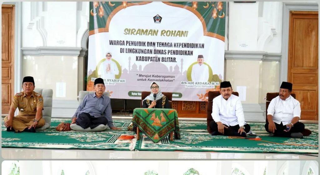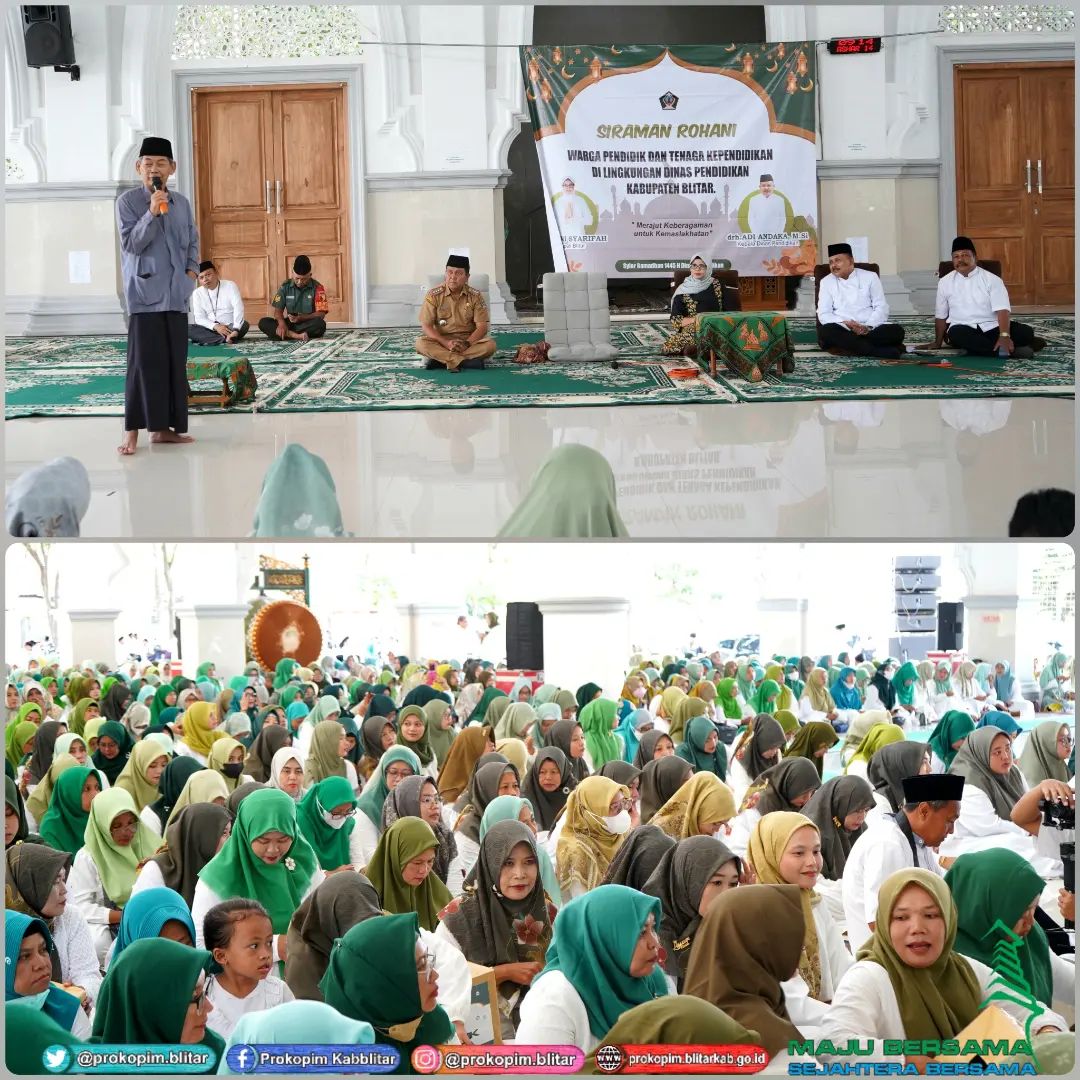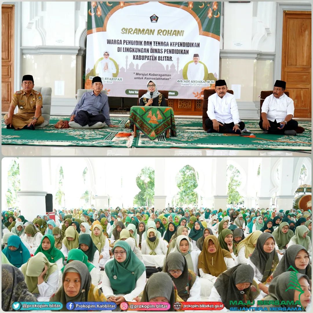 Bupati Blitar Hj. Rini Syarifah menghadiri Siraman Rohani untuk Pendidik dan Tenaga Kependidikan Guru PAUD dan SD se-Kabupaten Blitar. Kegiatan yang diinisiasi oleh Dinas Pendidikan tersebut berlangsung di Masjid Al-Fitroh Dermojayan Kecamatan Srengat , Selasa 2 April 2024.