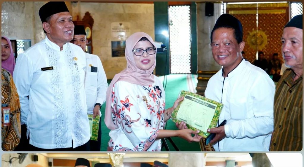 Bupati Blitar Hj. Rini Syarifah menyerahkan Kain Batik Ihram kepada Calon Jemaah Haji Kabupaten Blitar Tahun 2024 yang akan menunaikan Rukun Islam ke-5, beribadah haji ke tanah suci Mekah. Kegiatan tersebut berlangsung di Masjid Miftahul Jannah Wlingi, Rabu 24 April 2024.