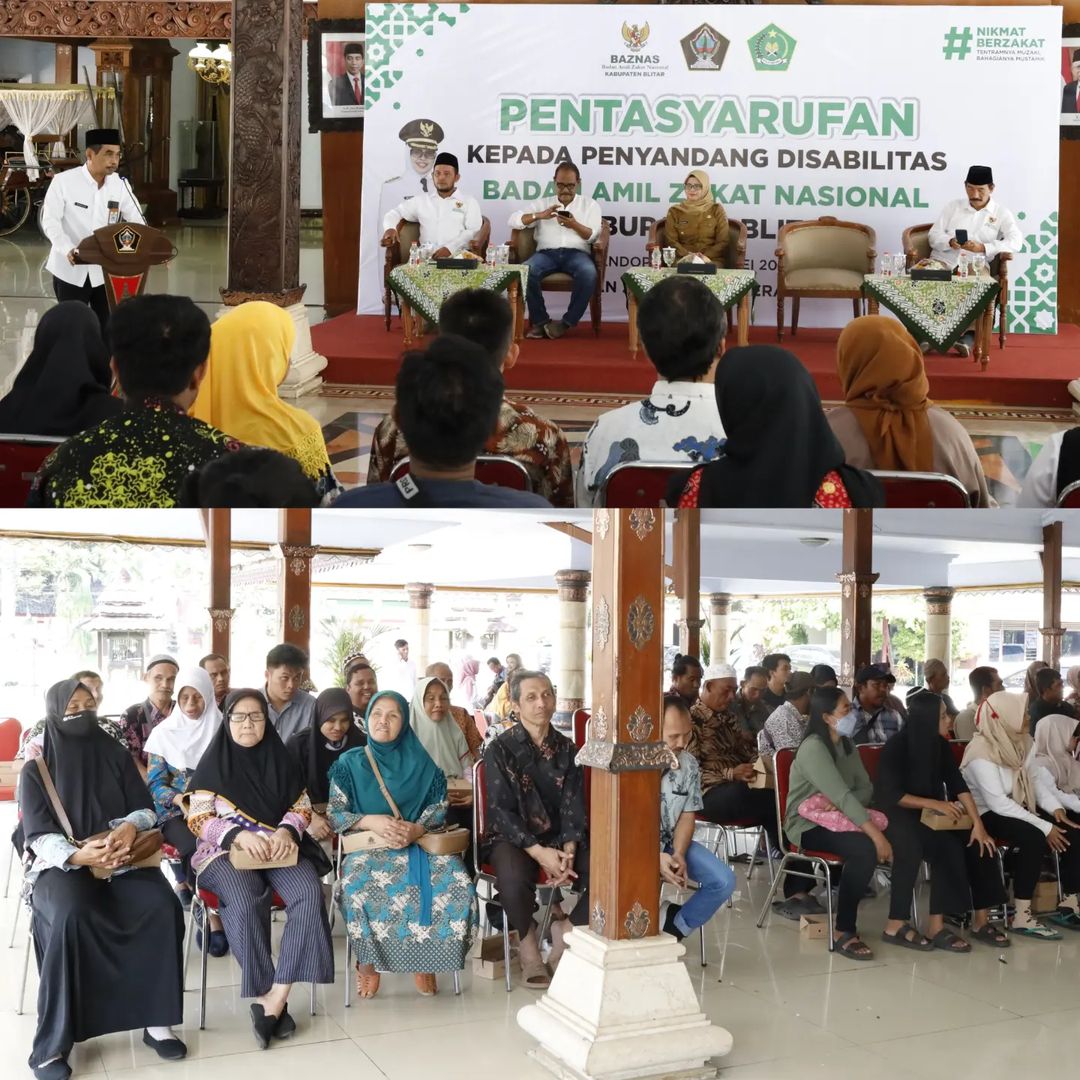 Bupati Blitar Hj. Rini Syarifah melaksanakan Pentasyarufan Baznas di Pendopo Ronggo Hadinegoro pada Selasa, 7 Mei 2024. Pentasyarufan Baznas kali ini di prioritaskan kepada penyandang disabilitas yang tergabung di PPDI, PERTUNI, dan GERGATIN Kabupaten Blitar.