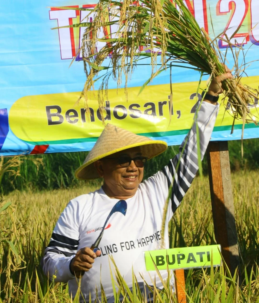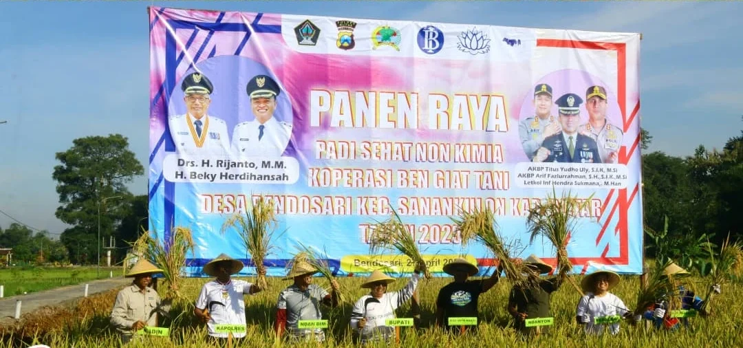 Bupati Blitar Drs. H. Rijanto, M.M, bersama Dandim 0808 dan Danyon 511, menghadiri acara Panen Raya Padi Sehat Non Kimia oleh Koperasi Ben Giat Tani di Desa Bendosari, Kecamatan Sanankulon Minggu, 27 April 2025. Turut hadir dalam kegiatan tersebut jajaran Pajak Pratama, BI Perwakilan Kediri, dan Perangkat Daerah terkait di Lingkungan Pemerintah Kabupaten Blitar.