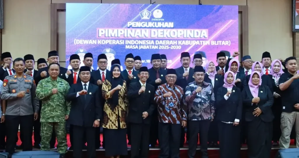 Bupati Blitar, Drs. H. Rijanto, MM menghadiri acara Pengukuhan Pimpinan Dewan Koperasi Indonesia Daerah (Dekopinda) Kabupaten Blitar masa jabatan 2025–2030 yang digelar di Aula Candi Penataran Kantor Bupati Blitar, Sabtu (18/4/2026). Acara pengukuhan ini turut dihadiri oleh perwakilan Forkopimda Blitar, perwakilan Dekopinwil Jawa Timur, Asisten, serta Kepala Perangkat Daerah di lingkungan Pemerintah Kabupaten Blitar.